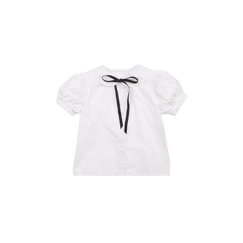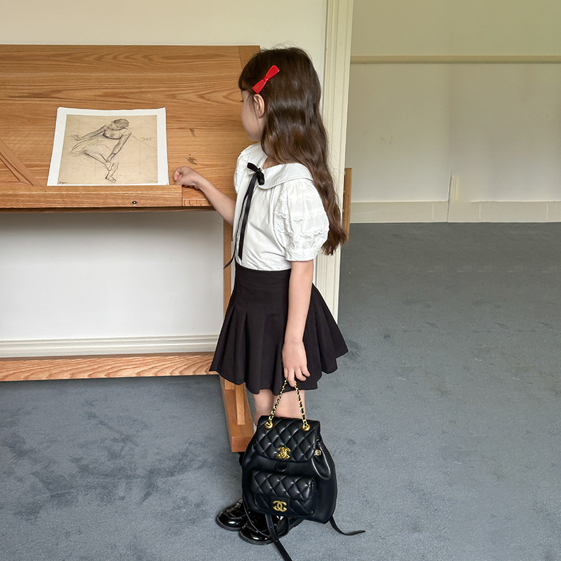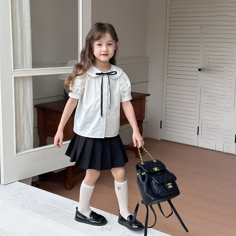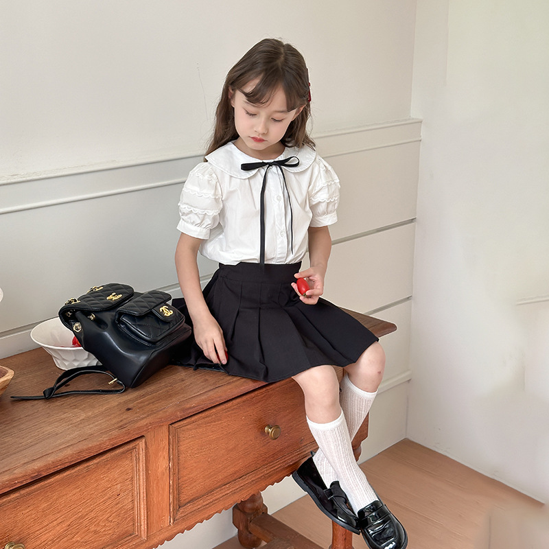 艾摩贝贝夏儿童学院风套装女童泡泡短袖蝴蝶结衬衫+百褶短裙2件套