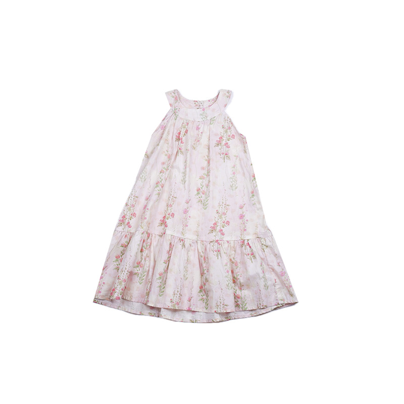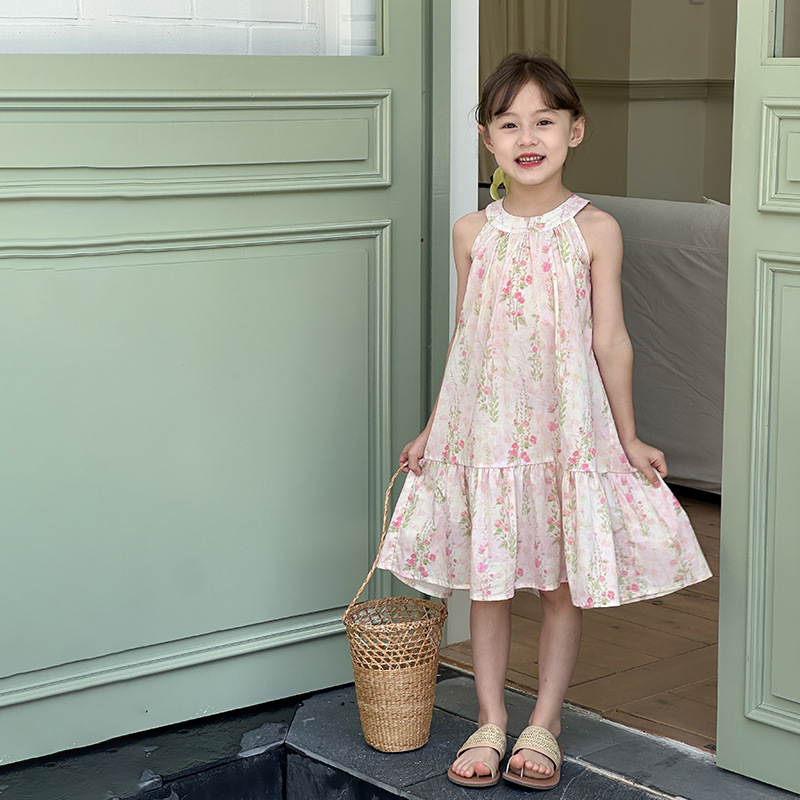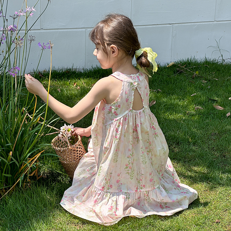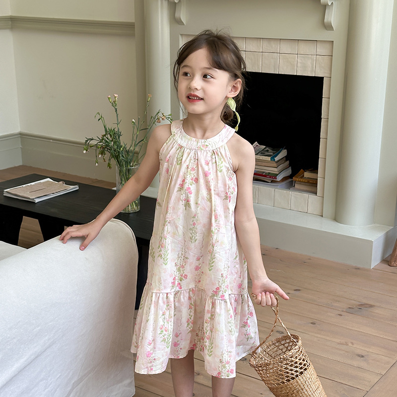 艾摩贝贝儿童法式气质公主裙夏装女童甜美粉花露背挂脖连衣裙