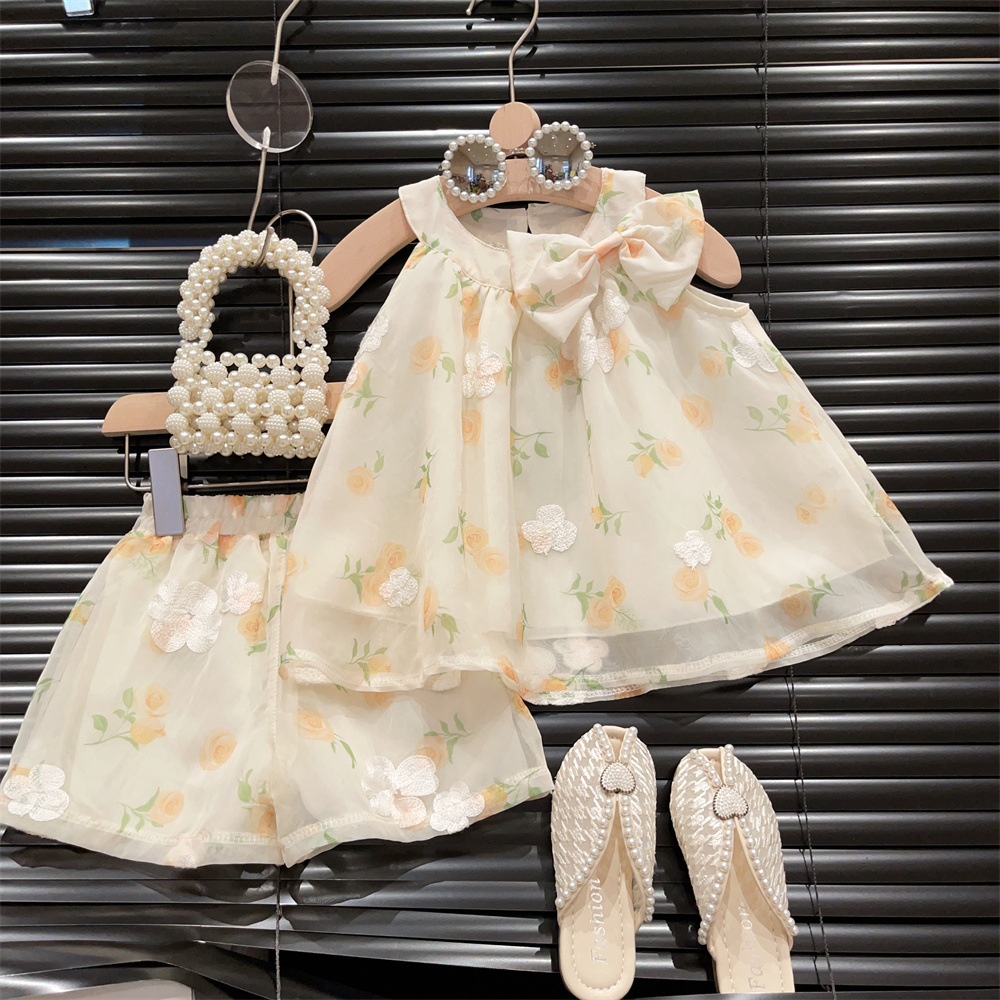 新品女童蝴蝶结装饰国风花朵刺绣娃娃衫短裤套装2025夏款两件套