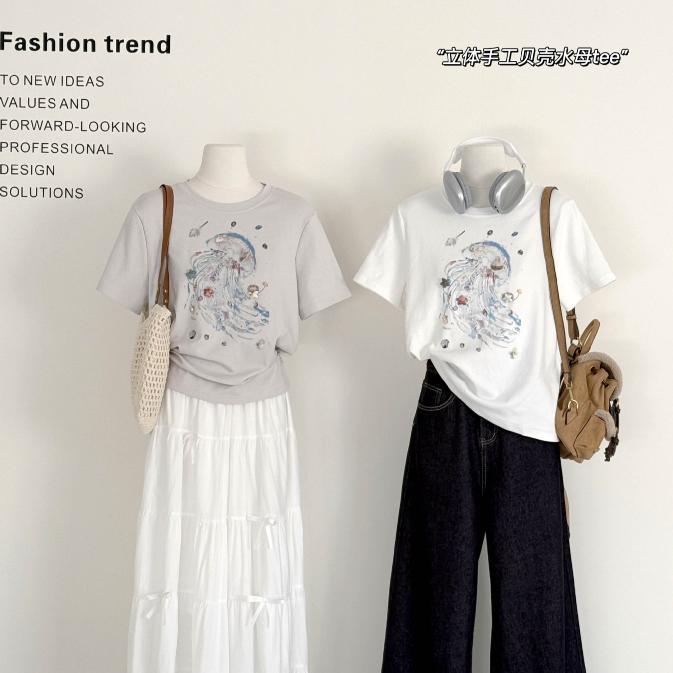 Hers夏季新款韩版甜美贝壳立体印花休闲宽松短袖T恤圆领百搭上衣