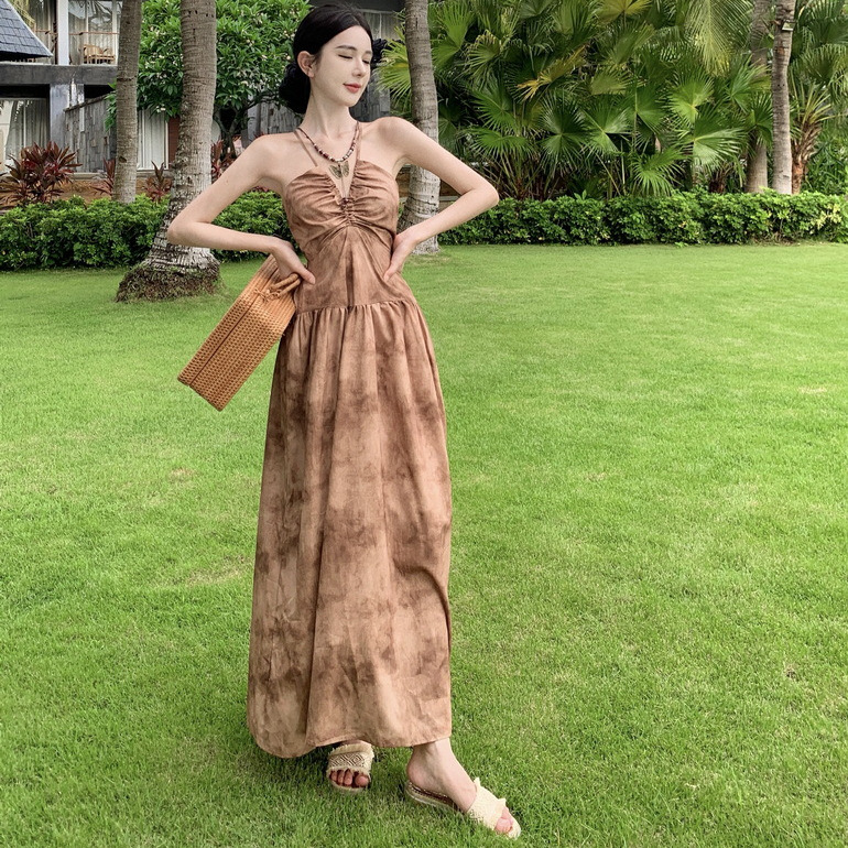 纯欲挂脖吊带v领连衣裙女夏季新款收腰露背性感咖色a字长裙