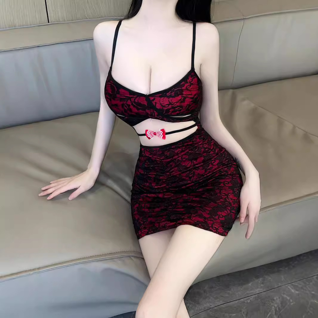 性感气质设计感诱惑辣妹低胸露背紧身蕾丝双层吊带镂空连衣裙爆款