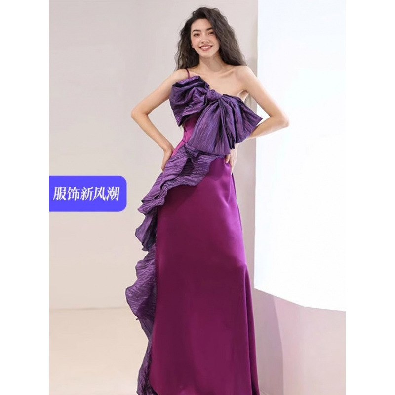 法式小众晨袍新款缎面新娘高级感敬酒服订婚晚礼服连衣裙紫色