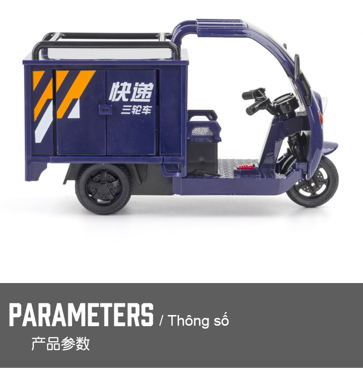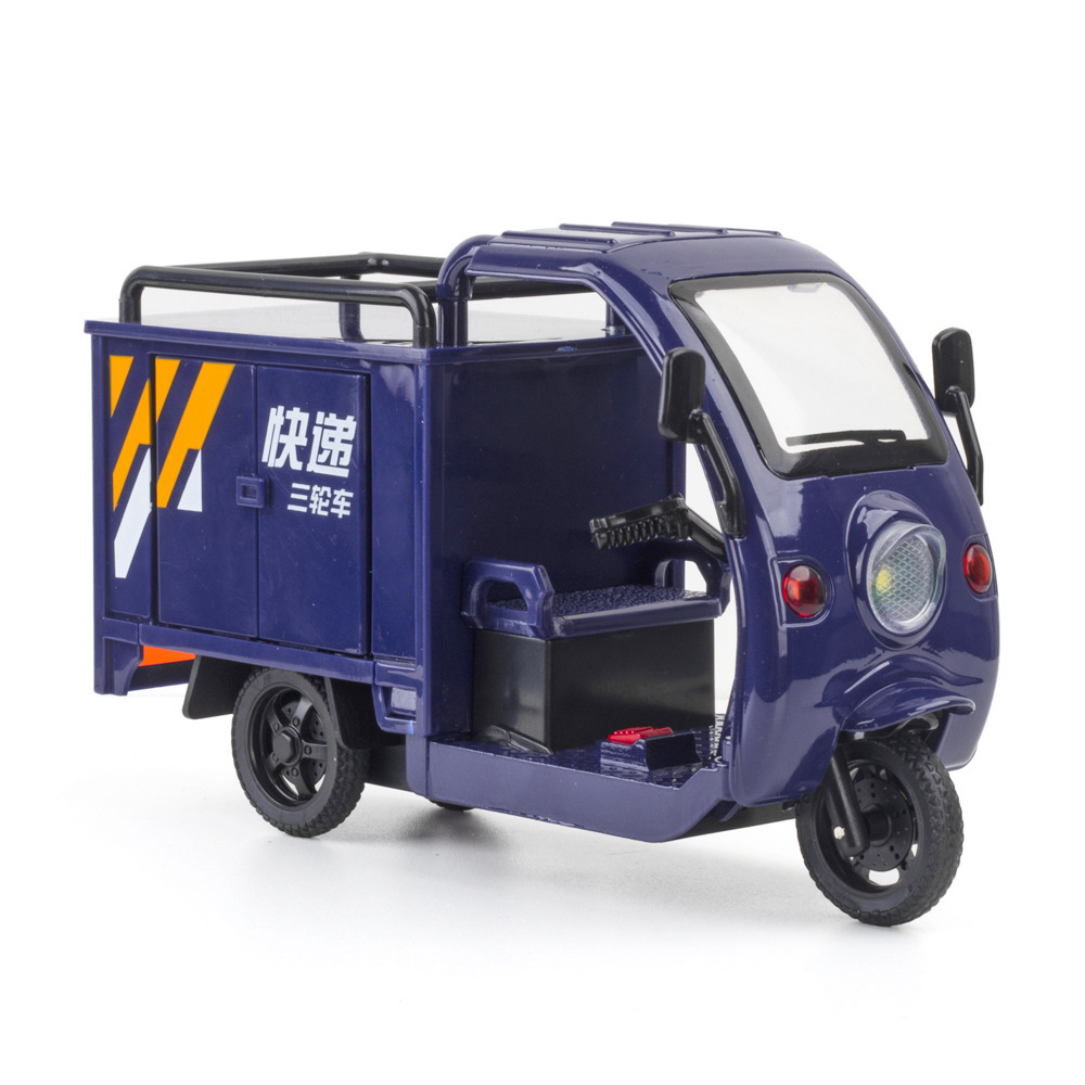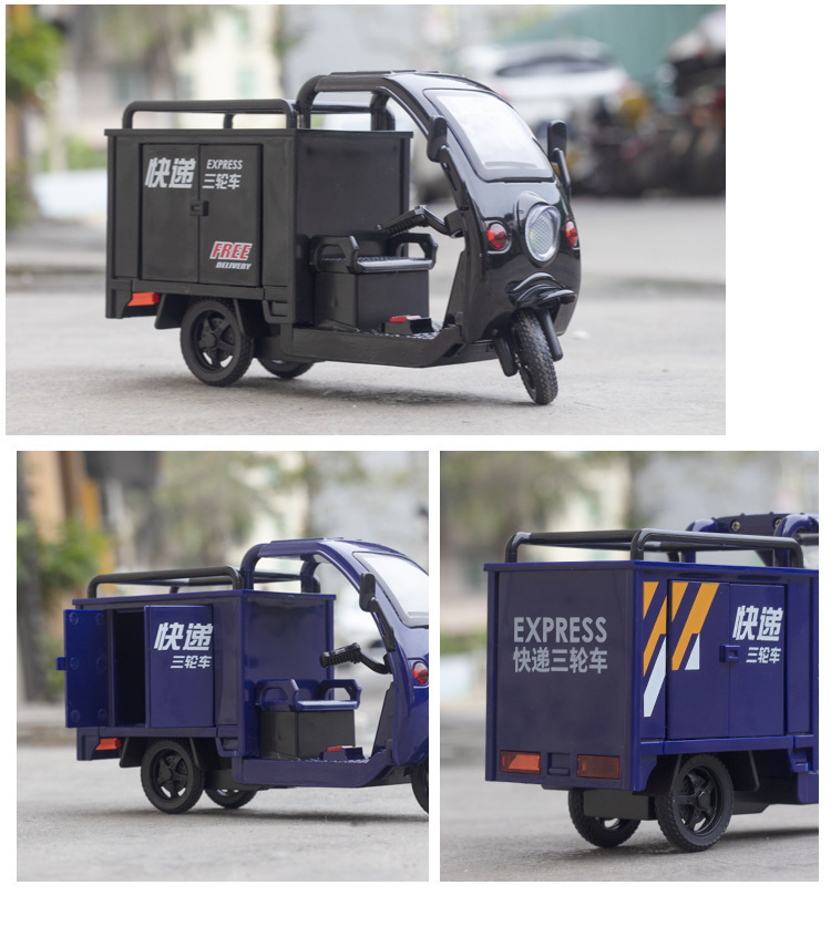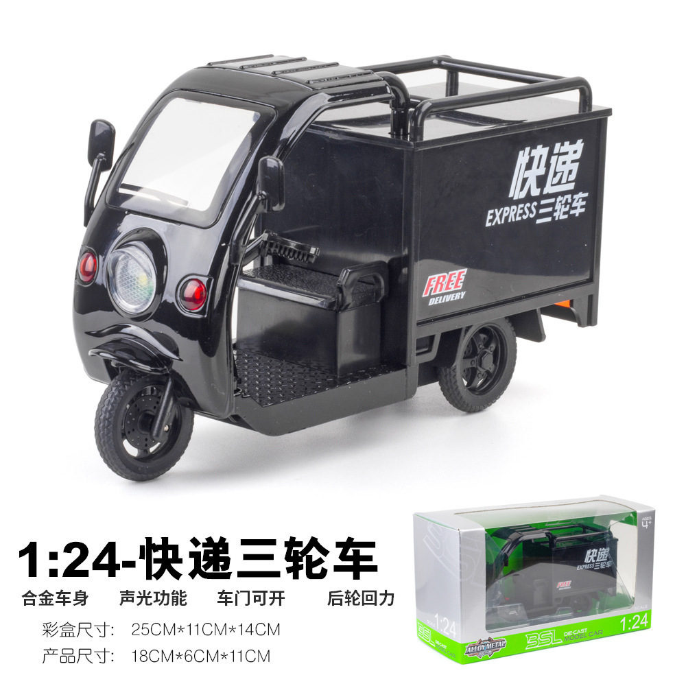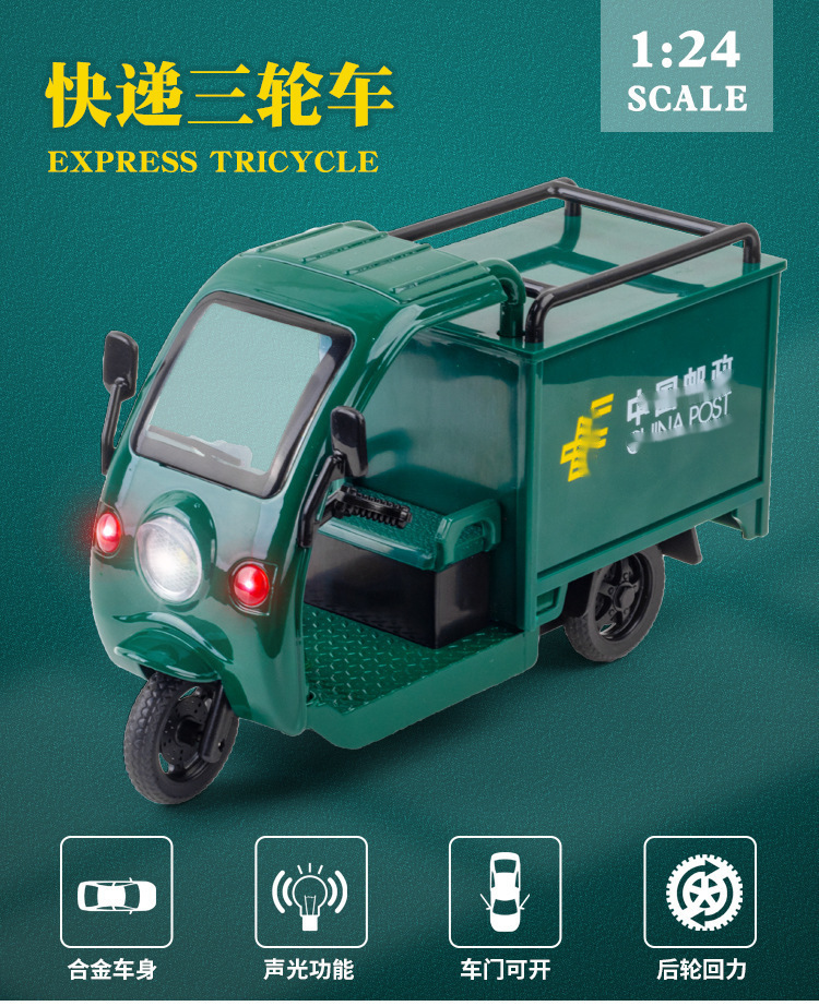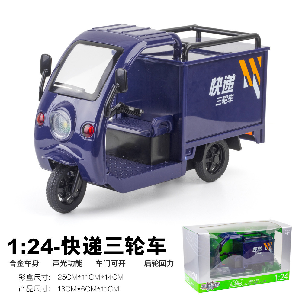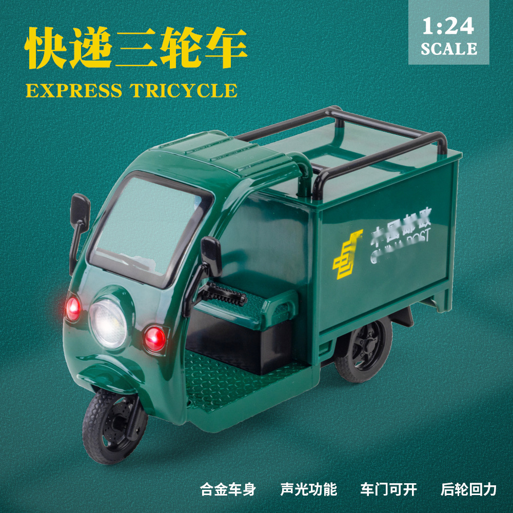 彩利信合金车模1:24快递三轮摩托车带声光回力玩具车音乐模型摆件