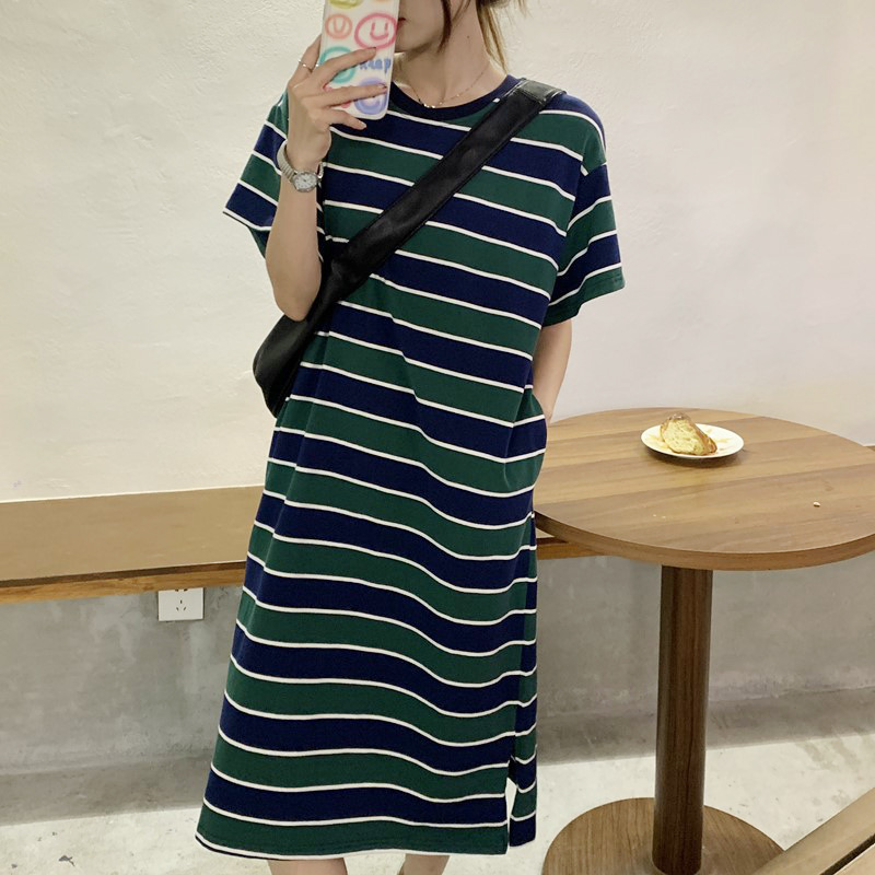 【价值高于价格】懒人条纹连衣裙中长款直筒裙夏季棉短袖t恤裙女