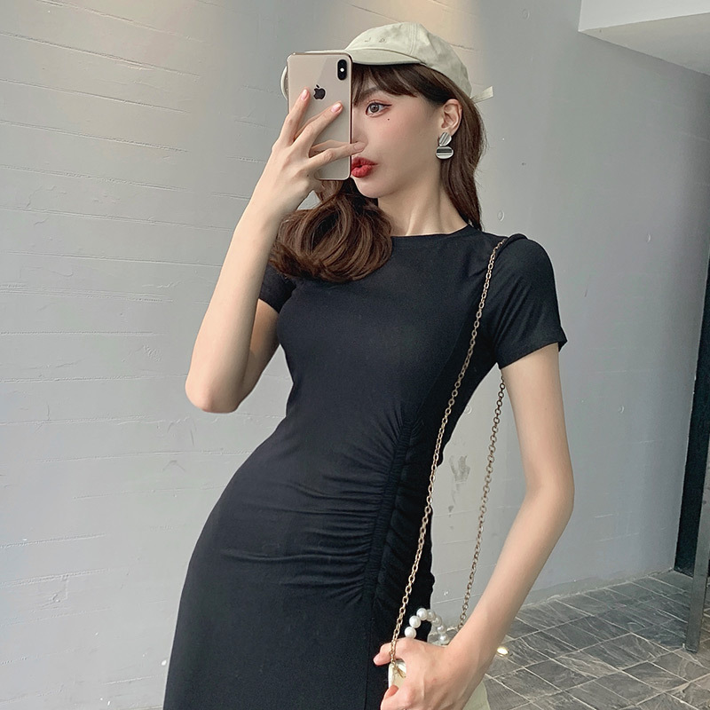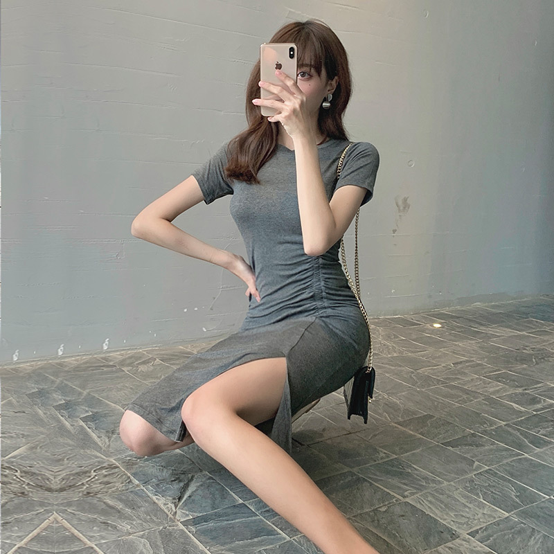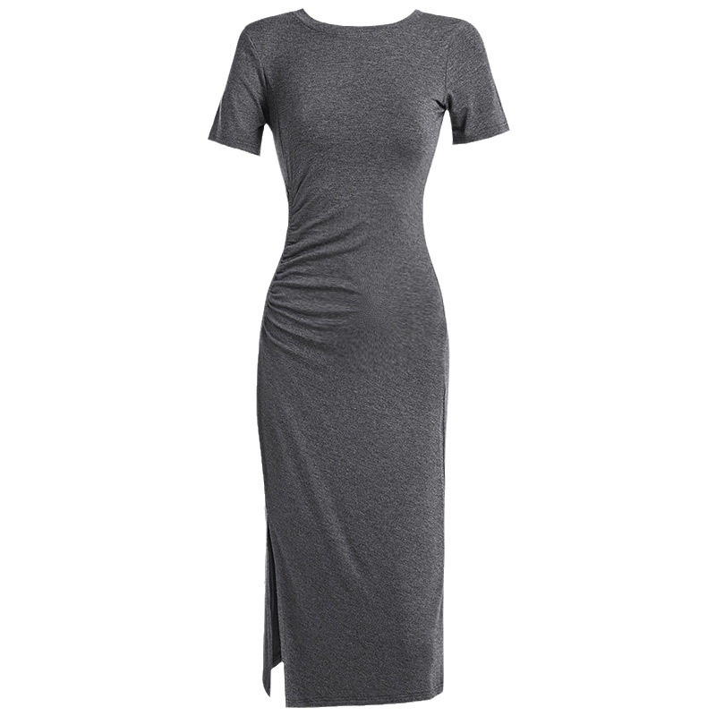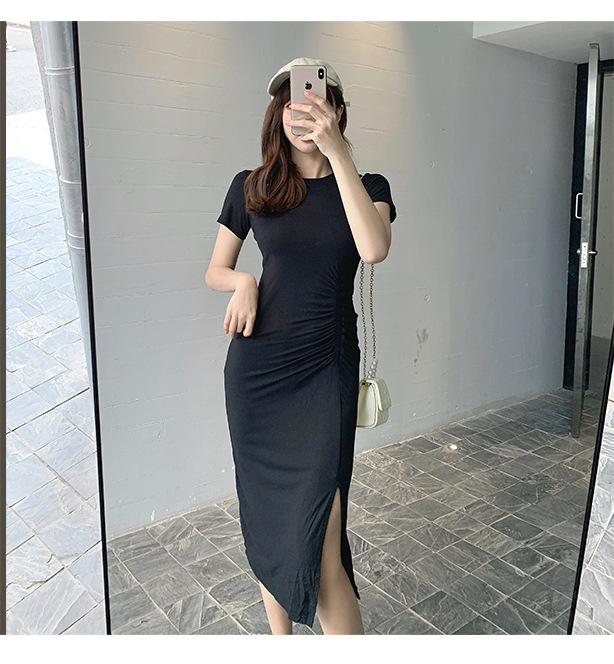 【价值高于价格】性感辣妹抽褶开叉连衣裙女夏修身显瘦短袖T恤裙