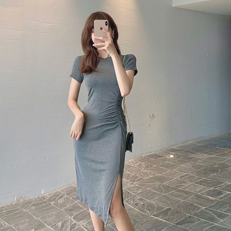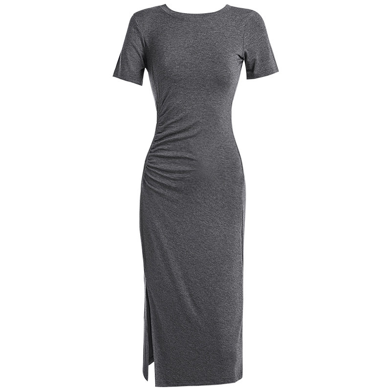 【价值高于价格】跨境外贸短袖连衣裙女夏季新款过膝开衩收腰长裙