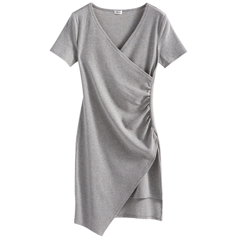 【价值高于价格】法式短袖连衣裙女夏v领不规则修身螺纹包臀裙子