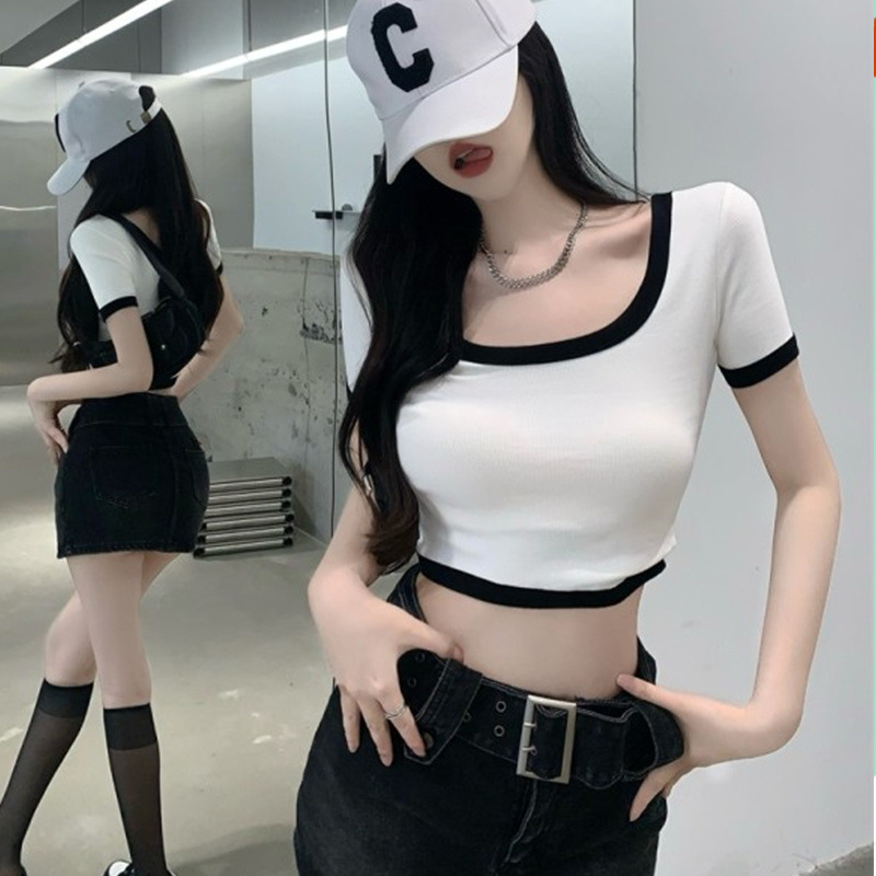 纯欲辣妹风大圆领显瘦撞色短款t恤女露脐性感多巴胺穿搭上衣欧货