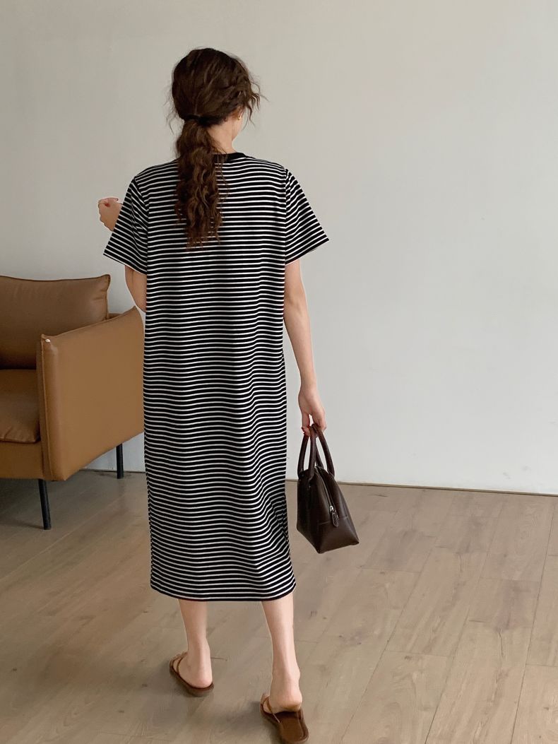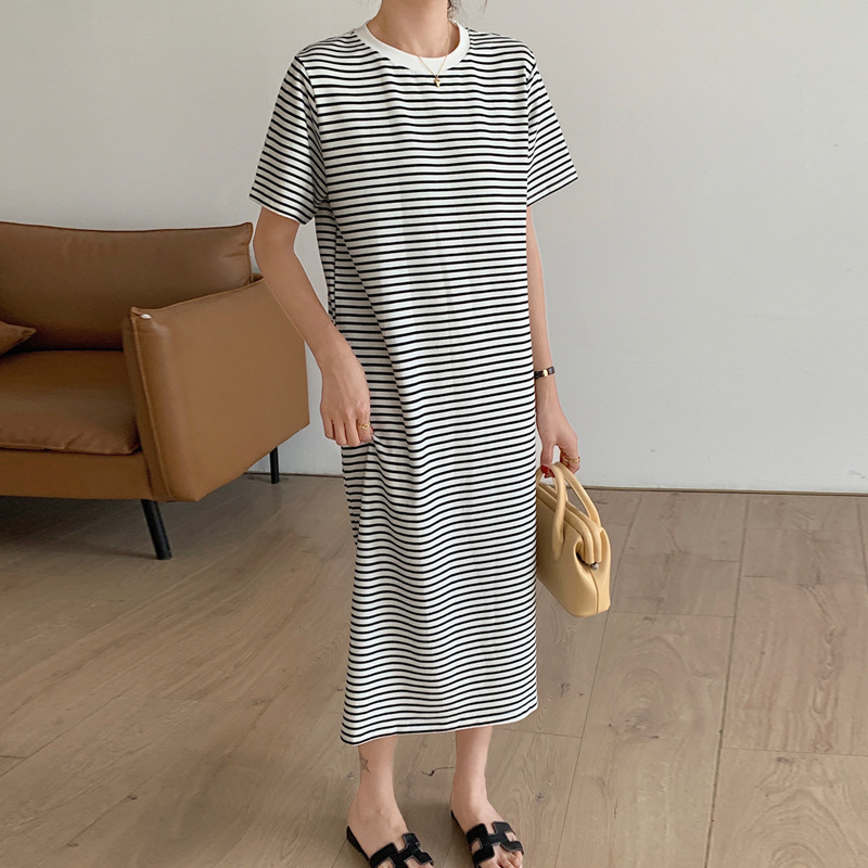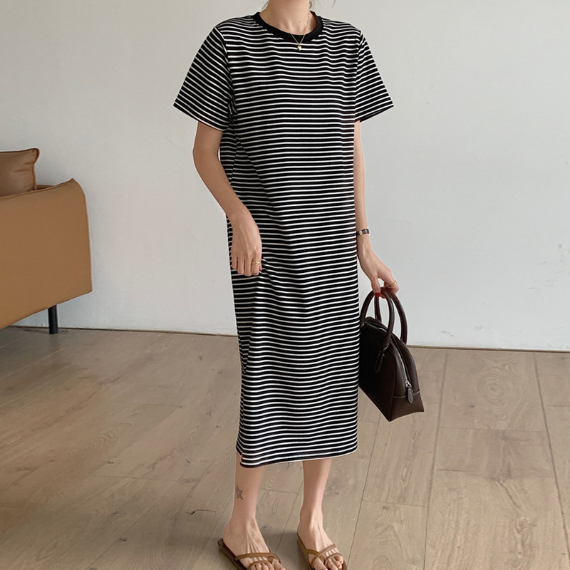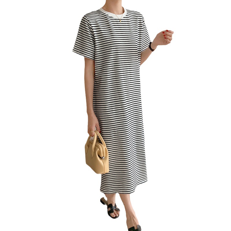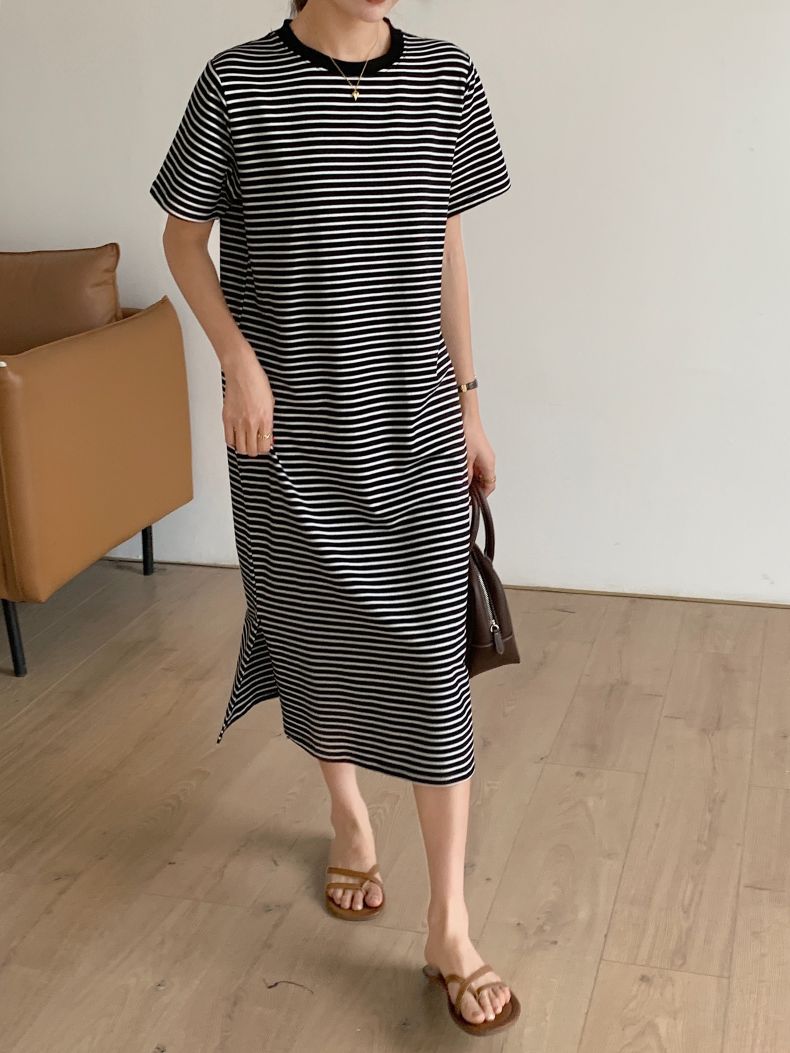 【价值高于价格】开衩黑白条纹连衣裙女宽松百搭短袖过膝裙长裙子