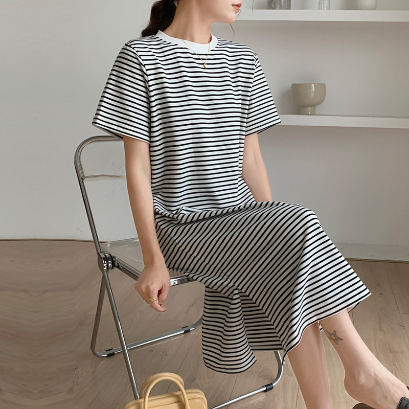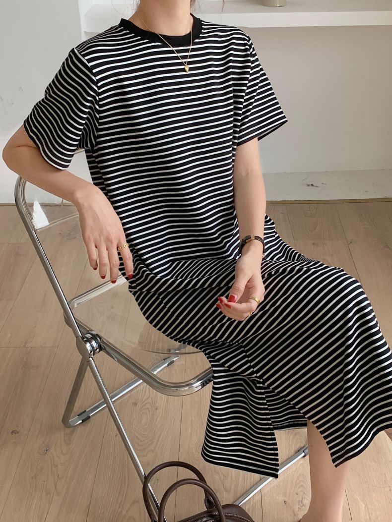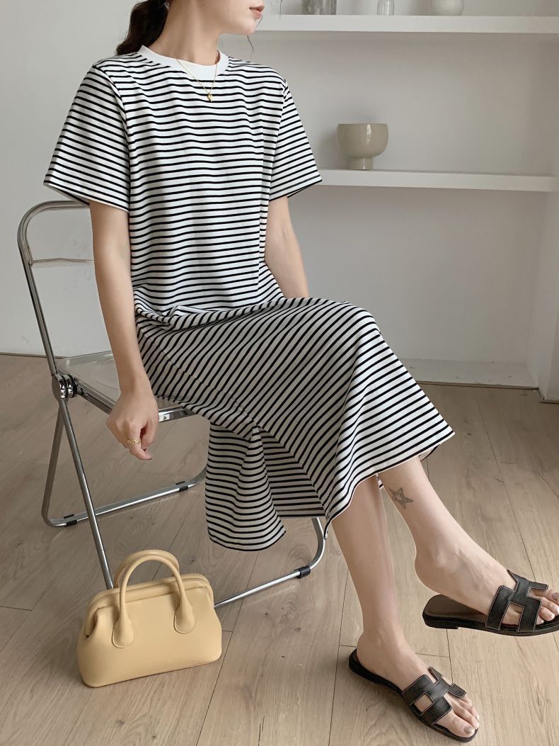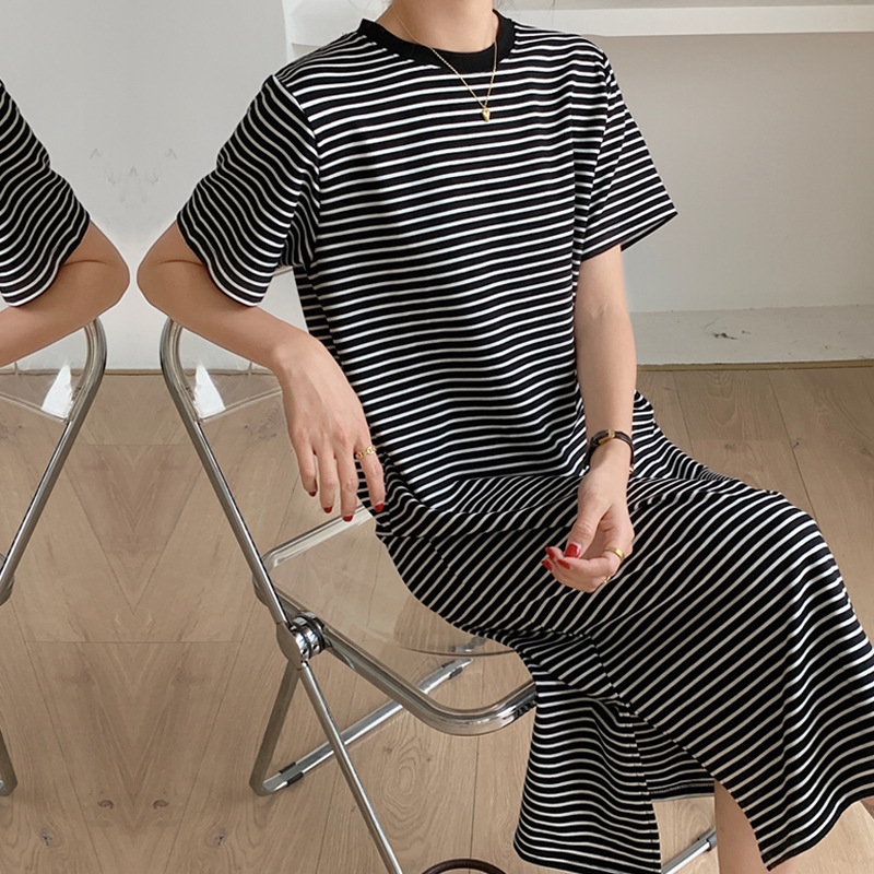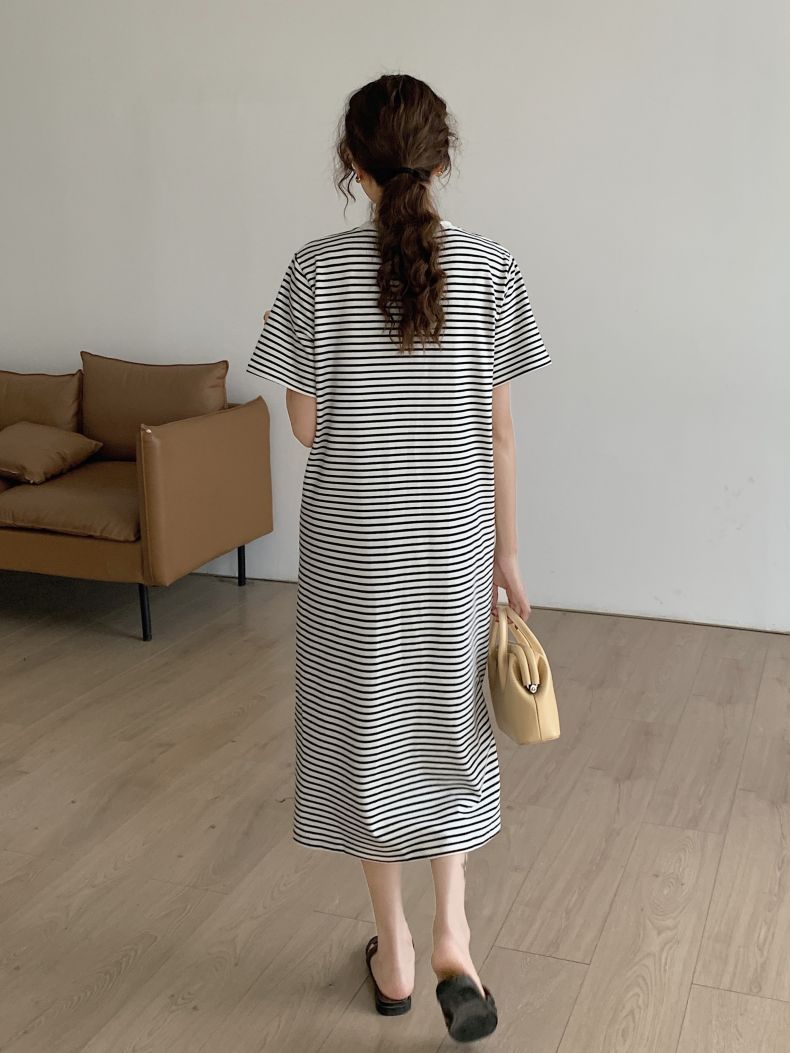 【价值高于价格】开衩黑白条纹连衣裙女宽松百搭短袖过膝裙长裙子
