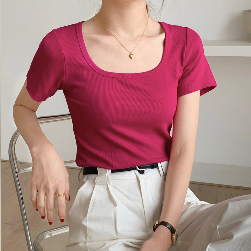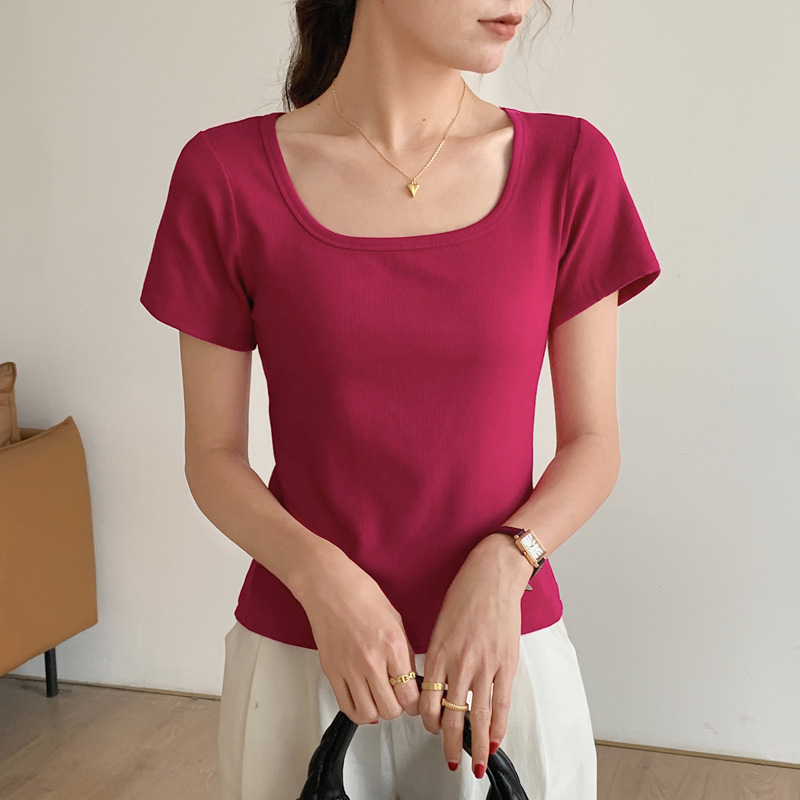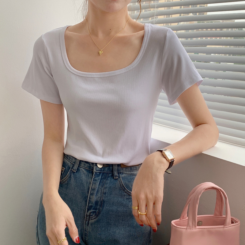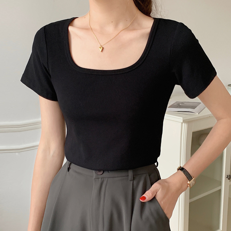 【价值高于价格】高弹螺纹短袖打底衫夏季新款方领百搭显瘦t恤女