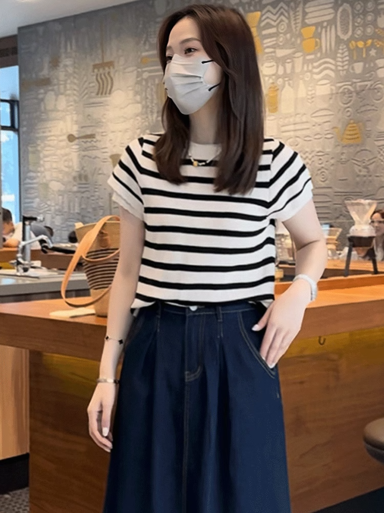 条纹冰丝针织衫短袖t恤女2025新款爆款夏季洋气时尚修身短款上衣