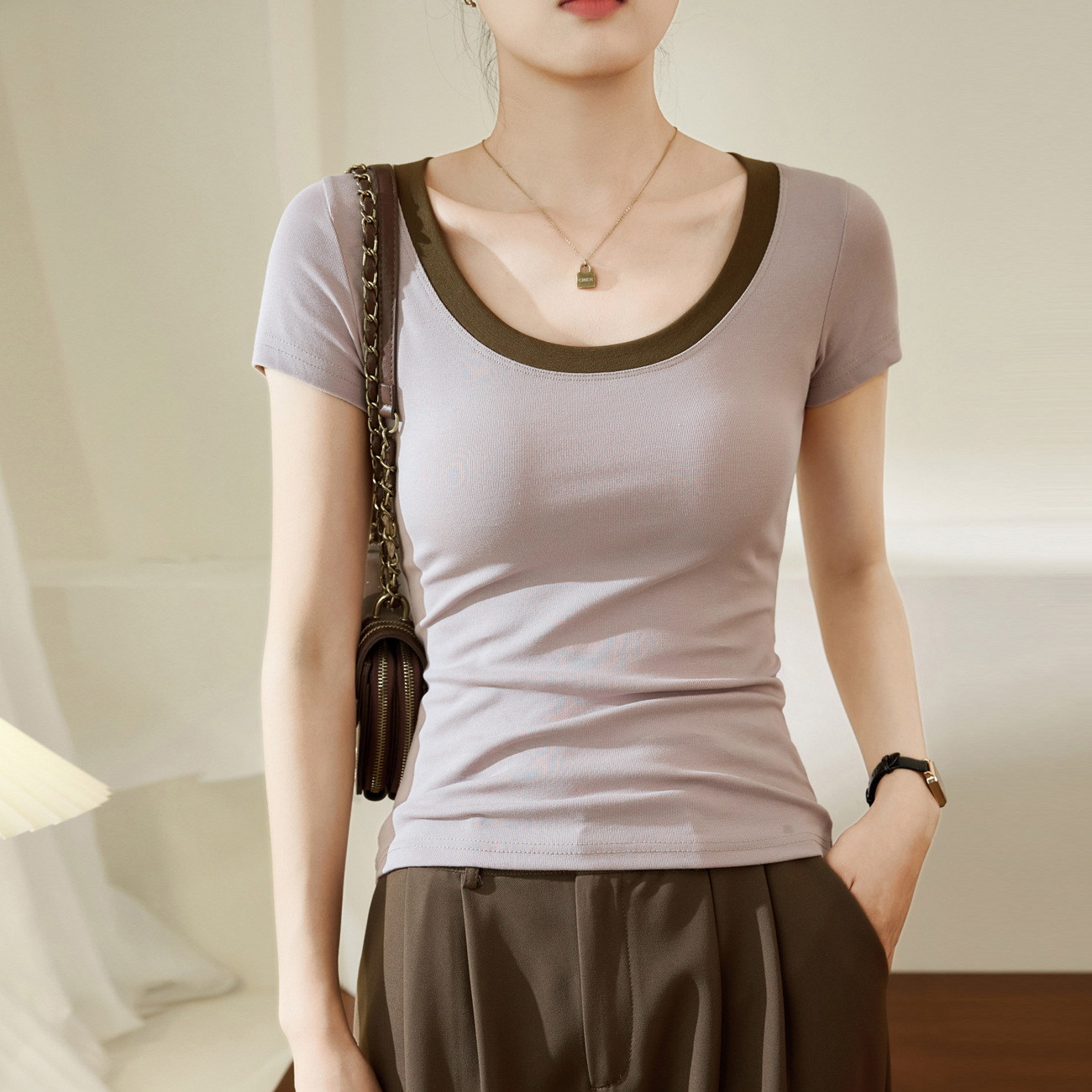 【价值高于价格】性感撞色大U领纯棉T恤女士夏季新款短袖显瘦上衣