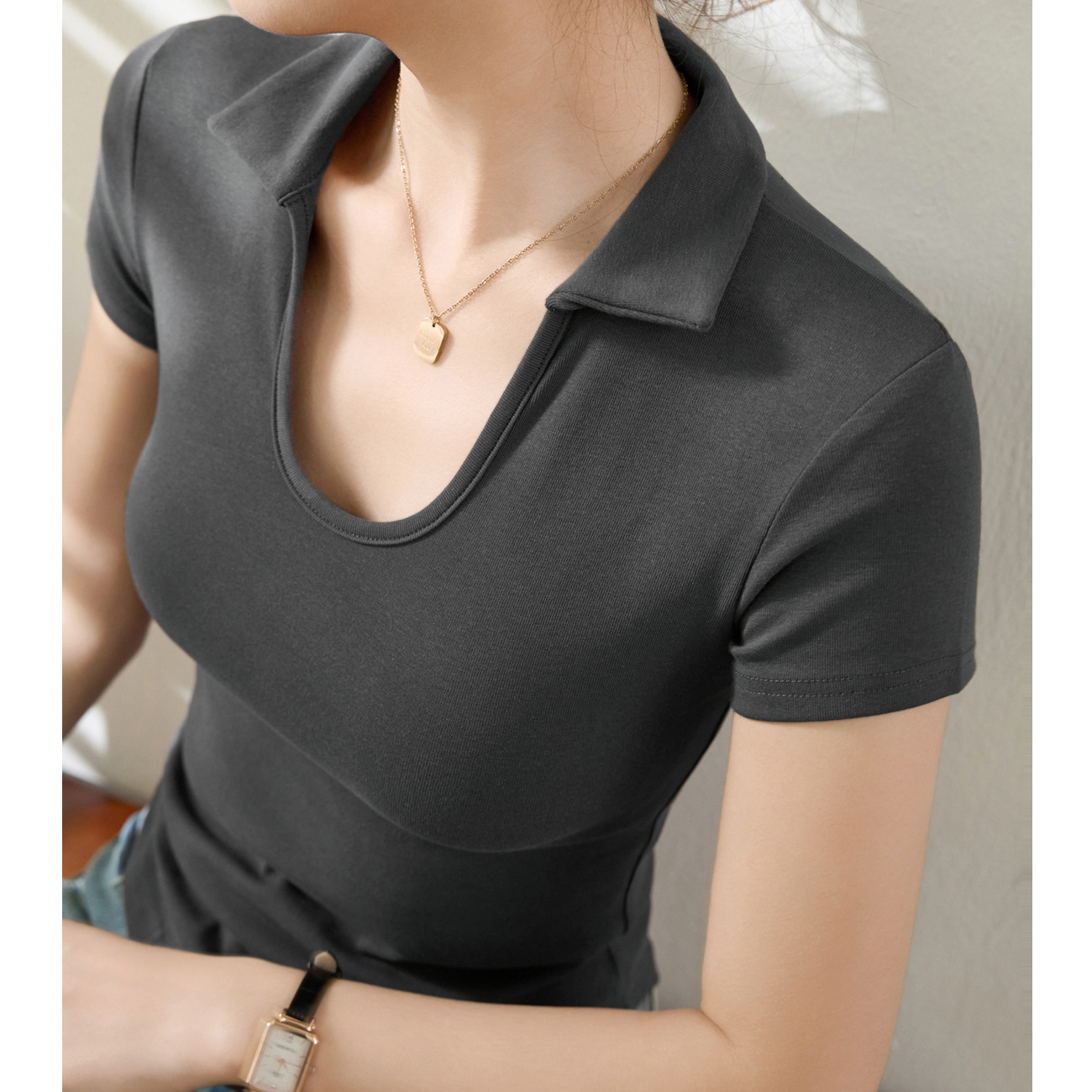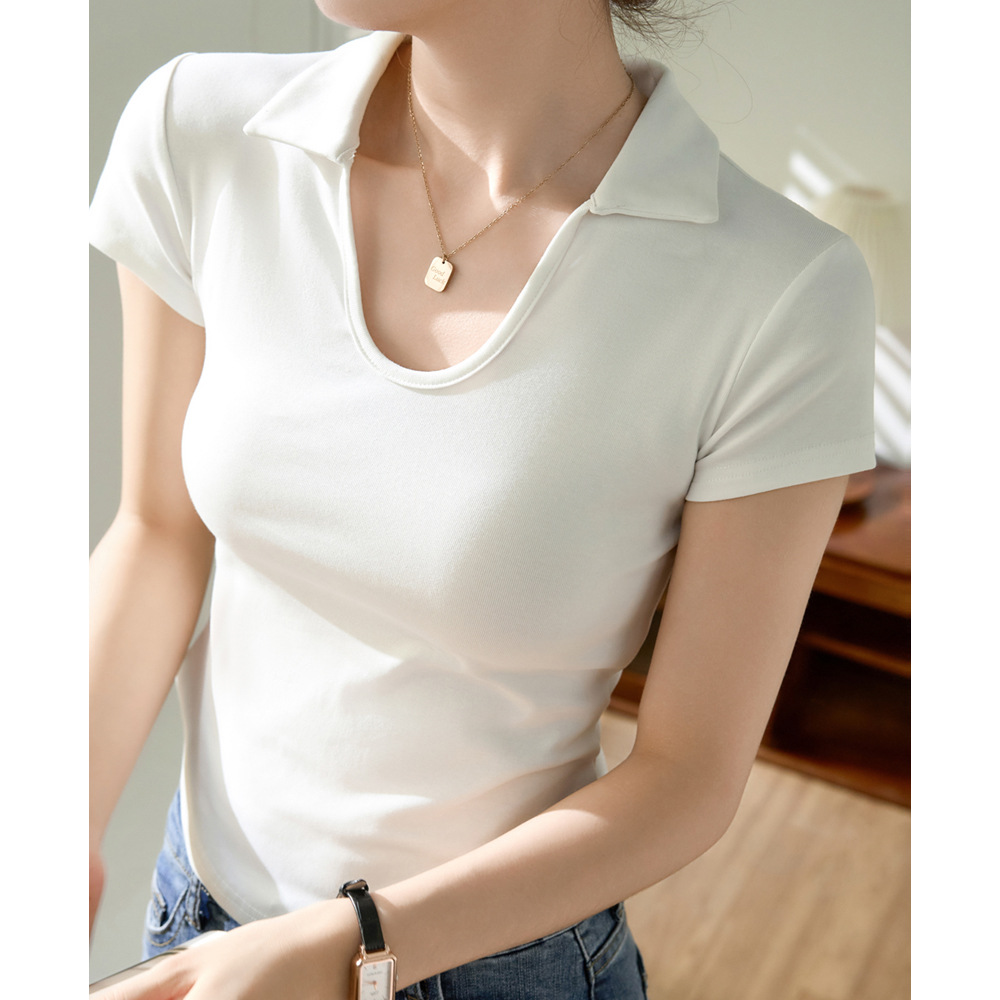 【价值高于价格】纯棉Polo领U型T恤女夏季新款心机性感短袖打底衫