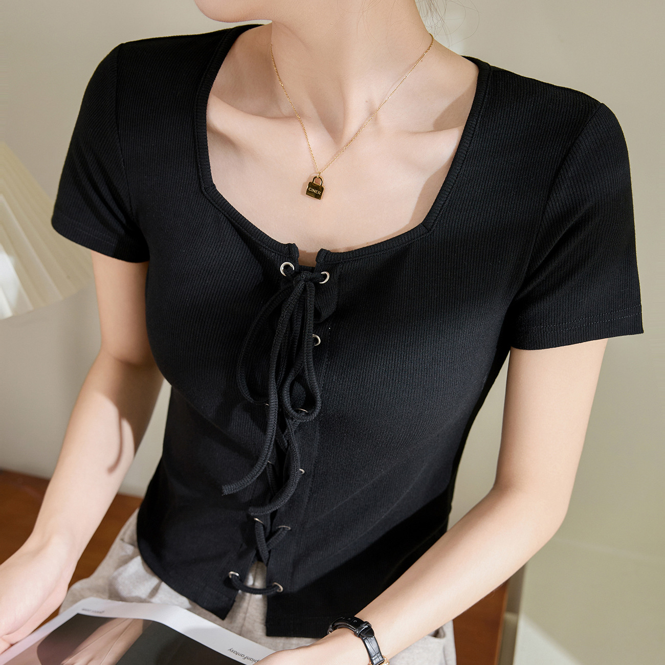 【价值高于价格】设计感绑带T恤女夏季新款方领短袖上衣时尚外穿
