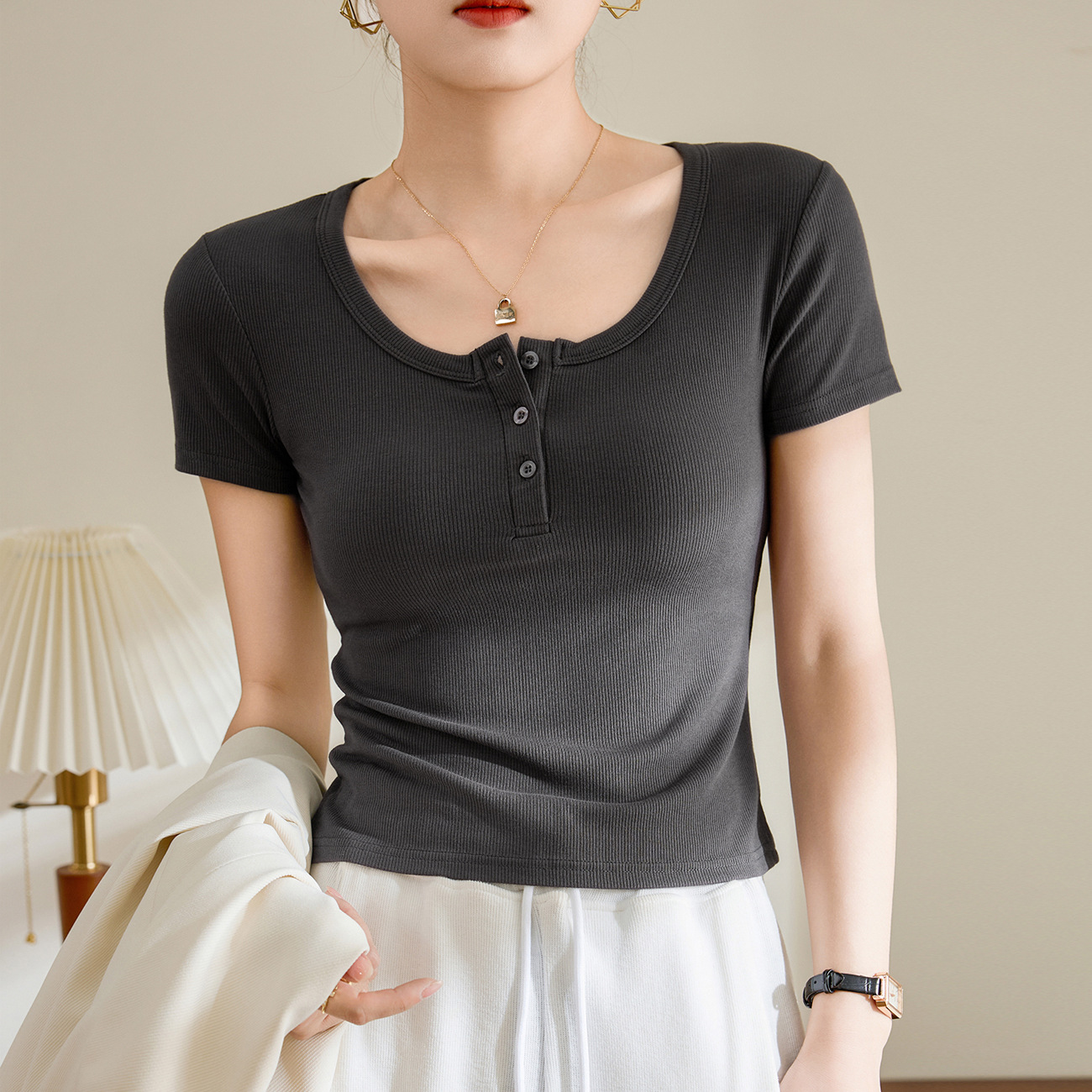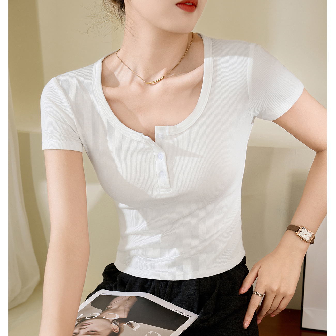 【价值高于价格】高腰短款T恤女夏季纽扣U领短袖上衣螺纹棉打底衫