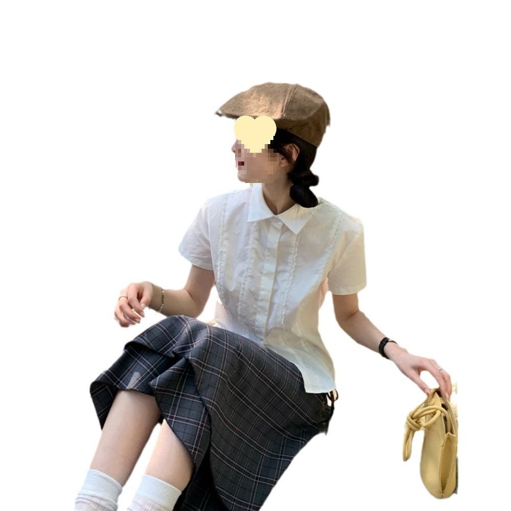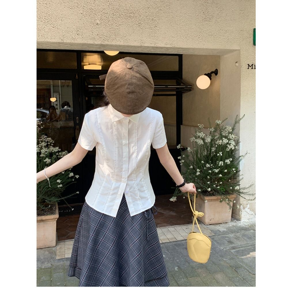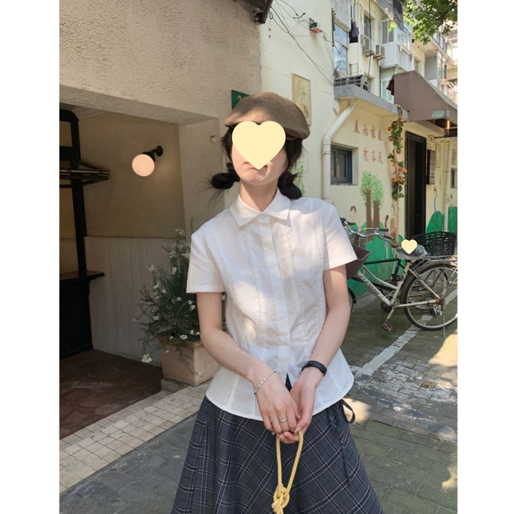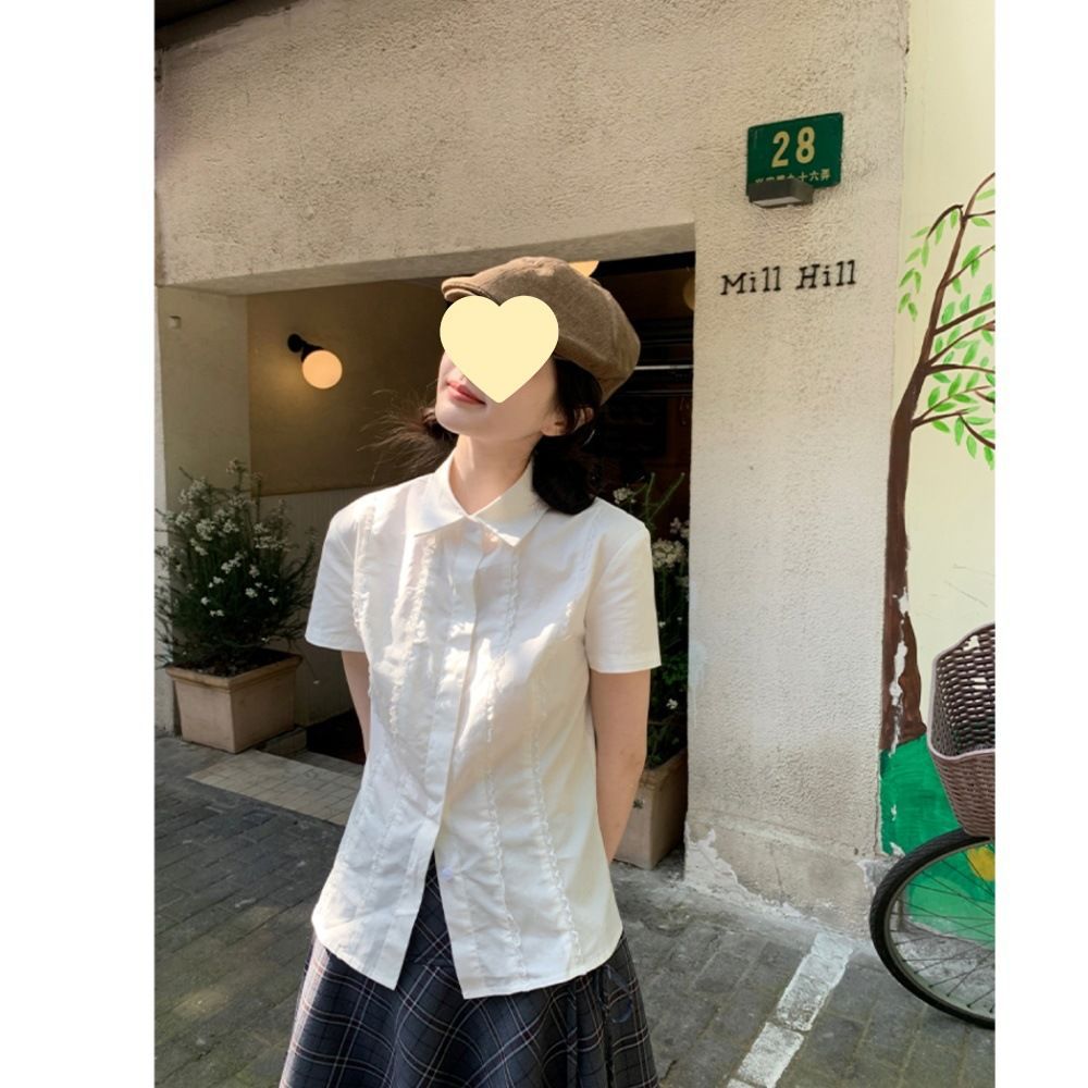 新款白色短袖衬衫女夏季学院风上衣设计感蕾丝花边修身衬衣女