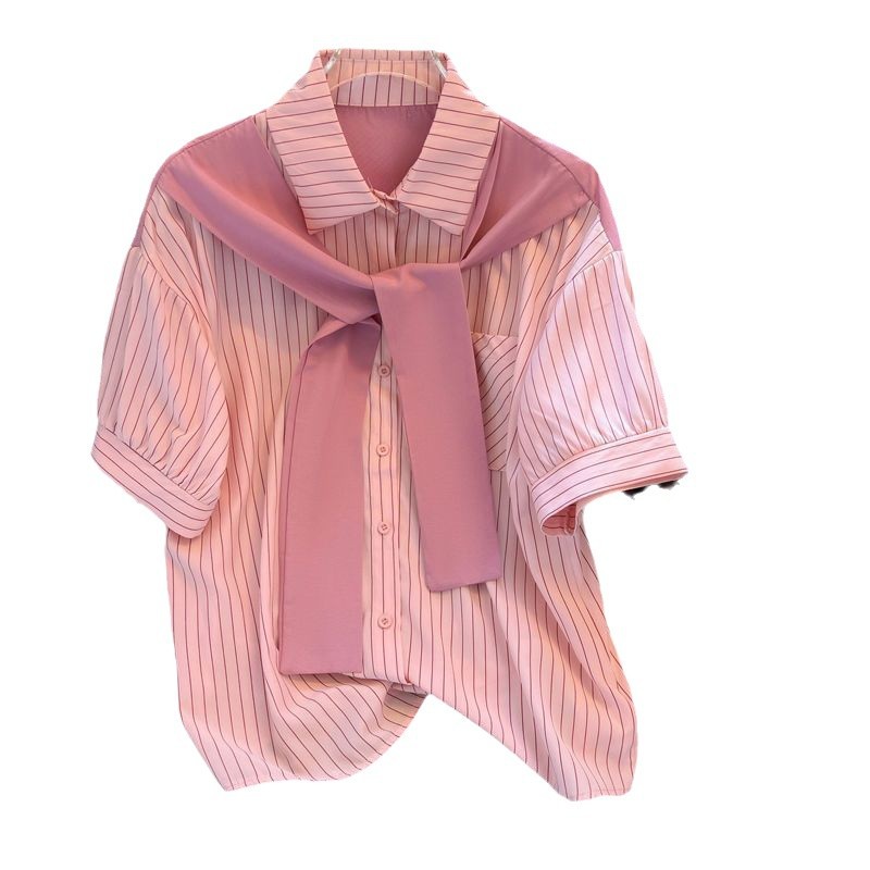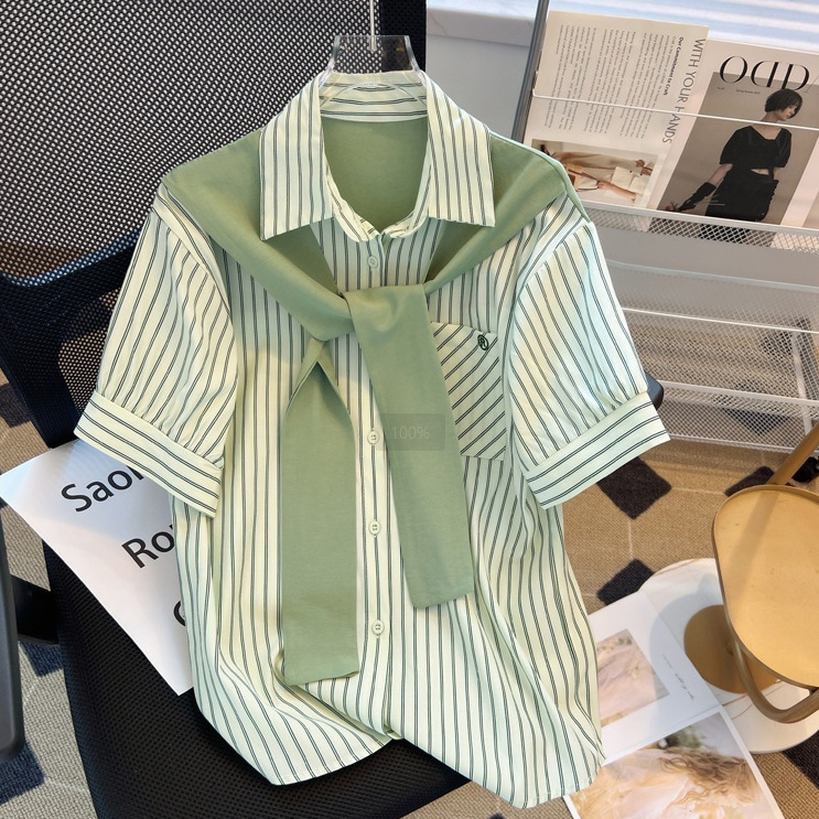 披肩条纹衬衫短袖夏装新款韩版职场轻熟法式感衬衣轻奢上衣女