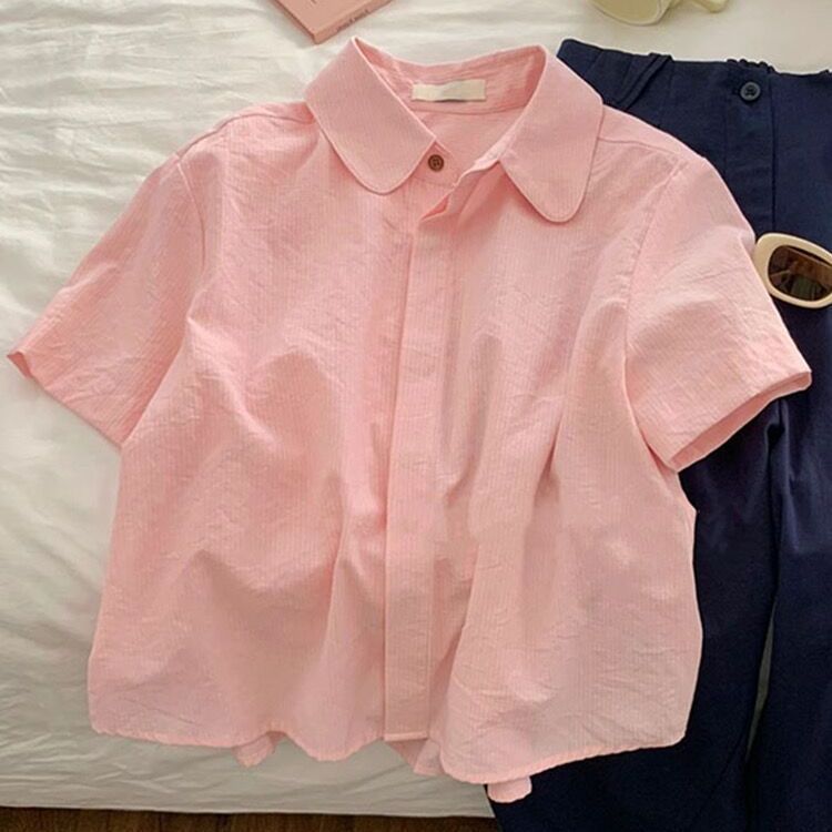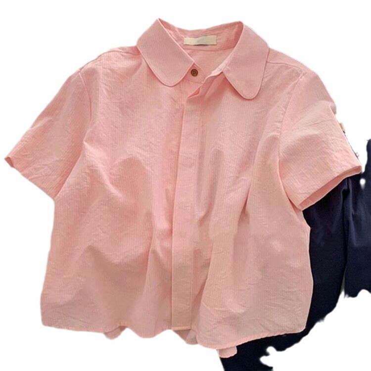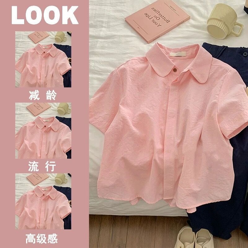 粉色Polo领短袖小众衬衫女夏季新款法式甜美别致百搭上衣