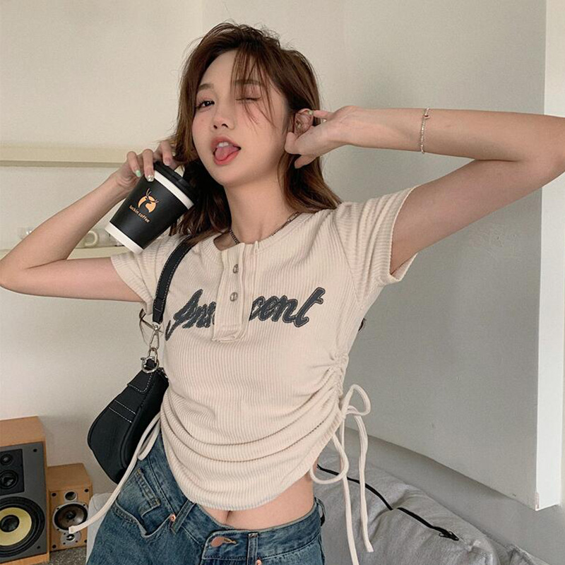 针织坑条抽绳短袖T恤女设计感小众夏季辣妹小个子正肩短款上衣桖