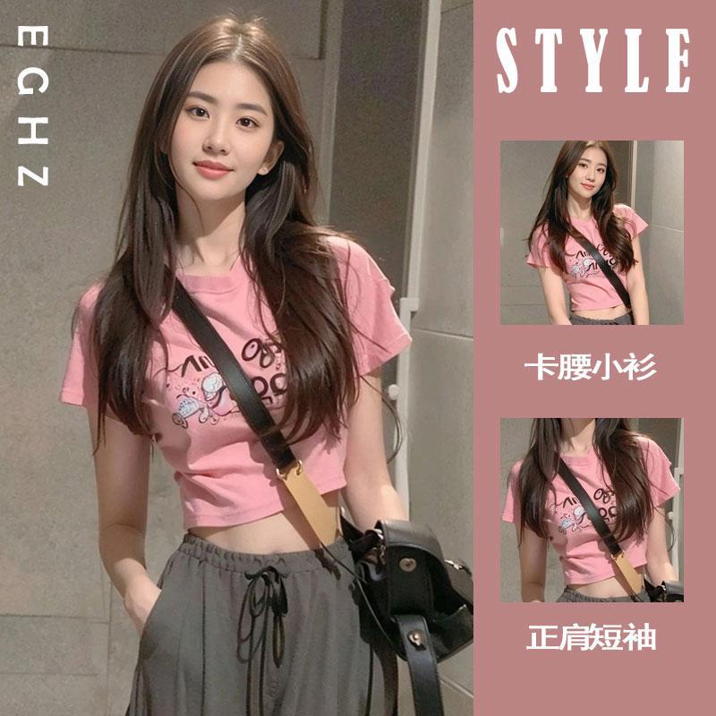 多巴胺穿搭粉色短袖t恤女设计感小众独特法式甜辣妹别致露脐上衣