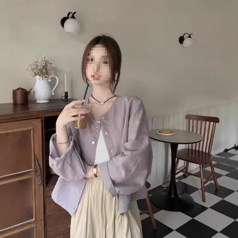 春夏季新款百搭紫色衬衣上衣女设计感小众小个子休闲防晒衬衫外套