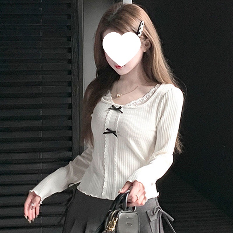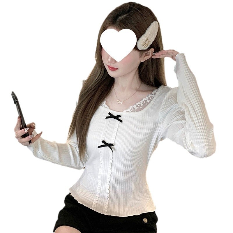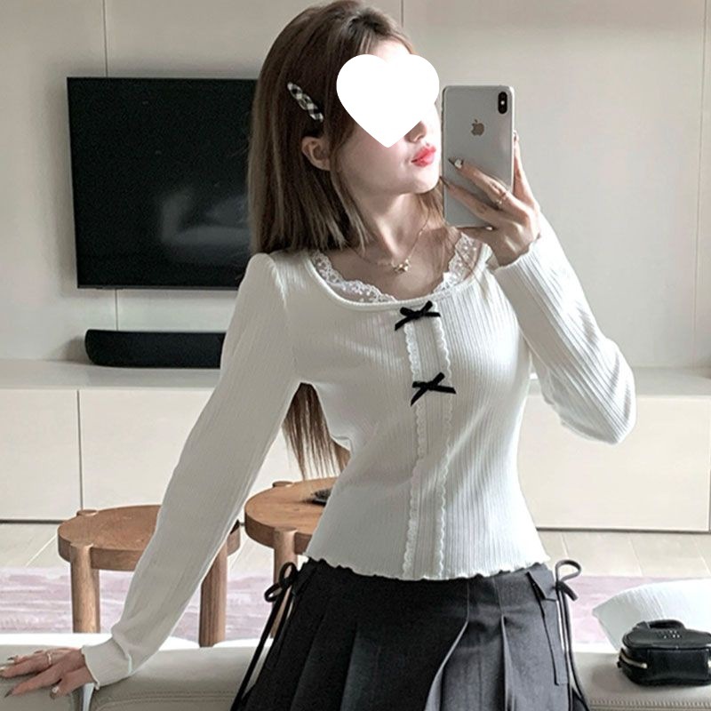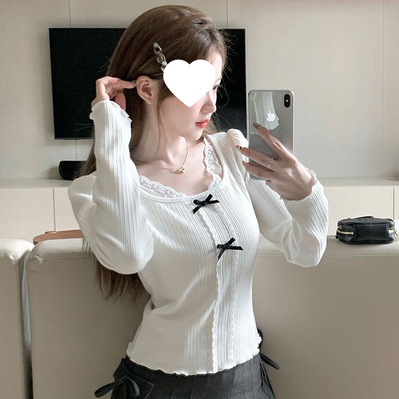 新款纯欲风辣妹蕾丝短款长袖t恤女修身显瘦设计感打底衫上衣