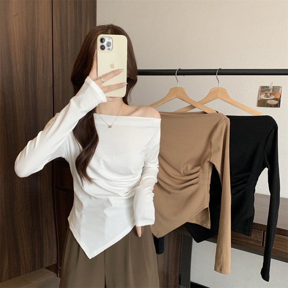 新款美式不规则别致上衣一字肩不规则薄款上衣ins潮色开叉长袖T恤