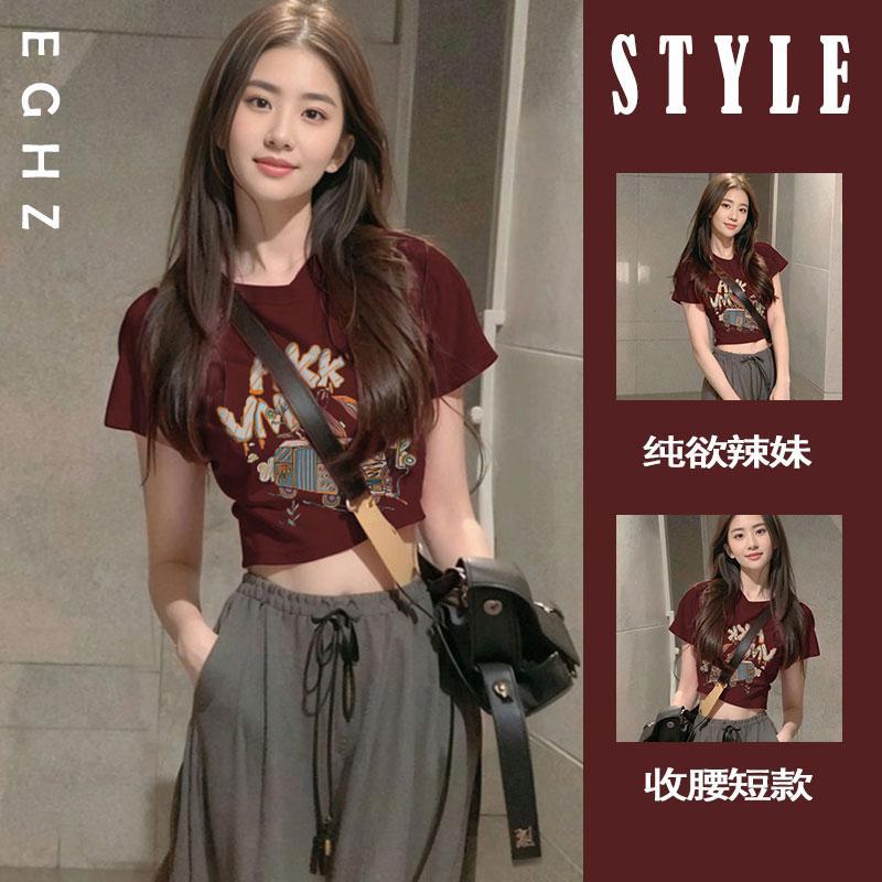 美式甜辣收腰显瘦短款上衣纯欲修身正肩T恤女夏小众设计感小上衣