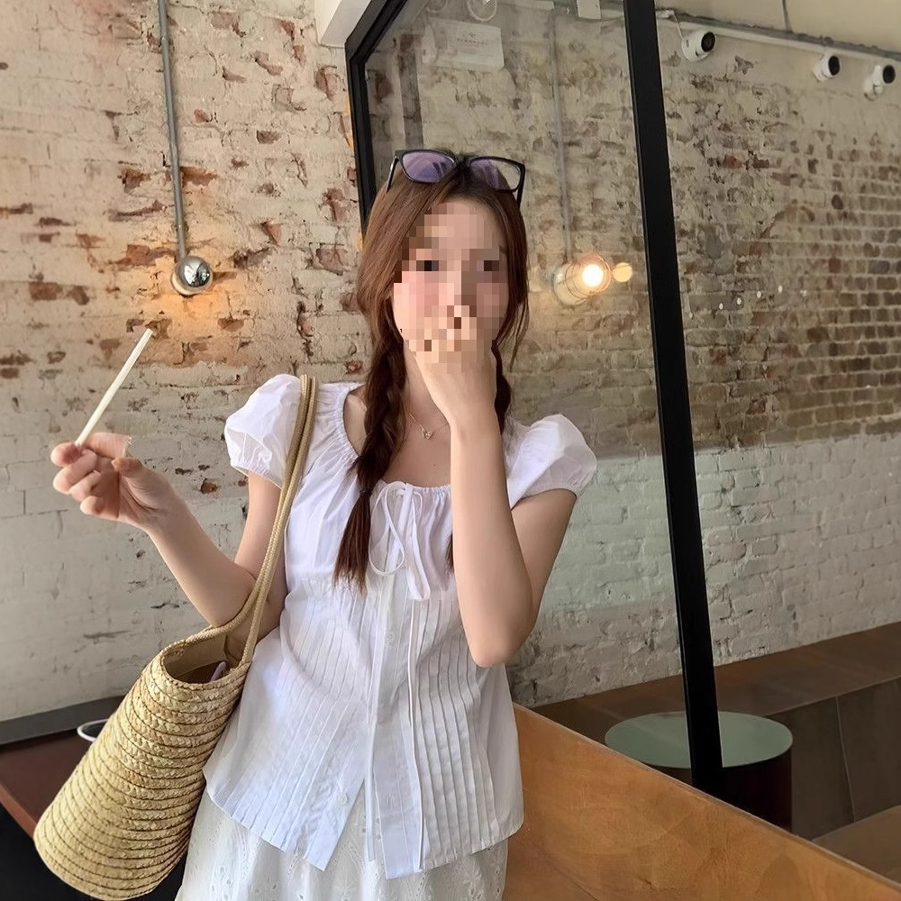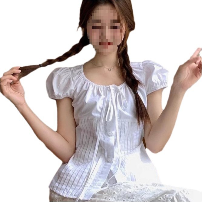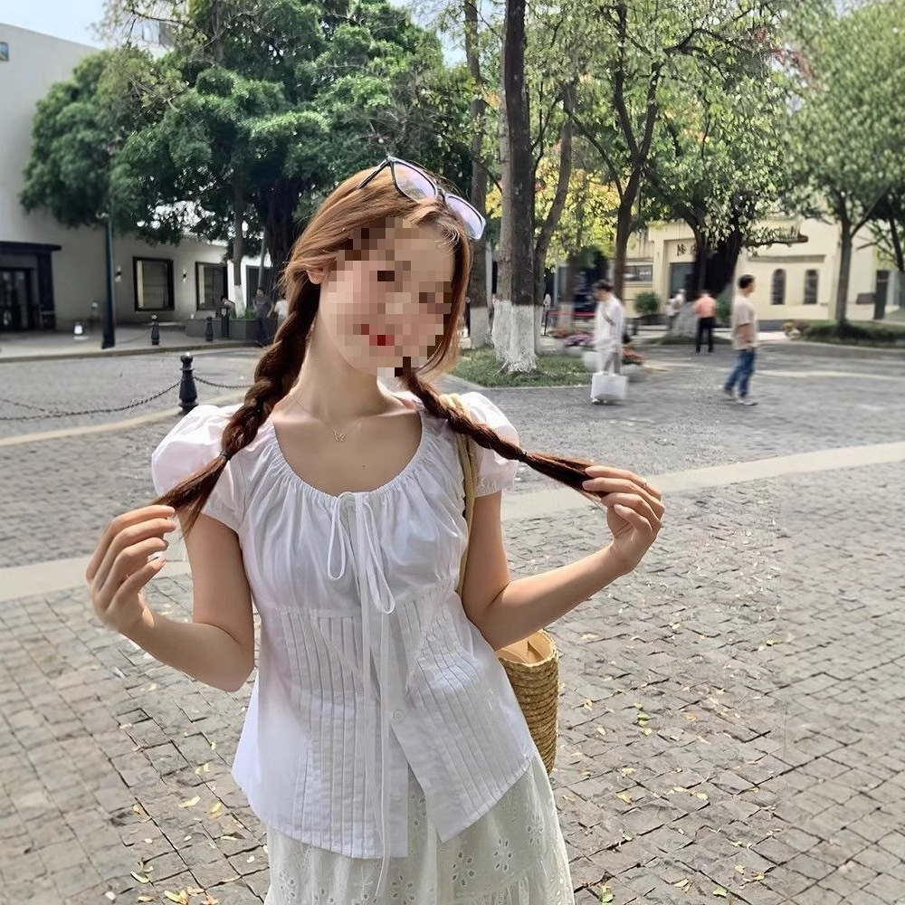 压褶系带圆领白色泡泡袖衬衫女薄款单排扣显瘦小个子短款上衣