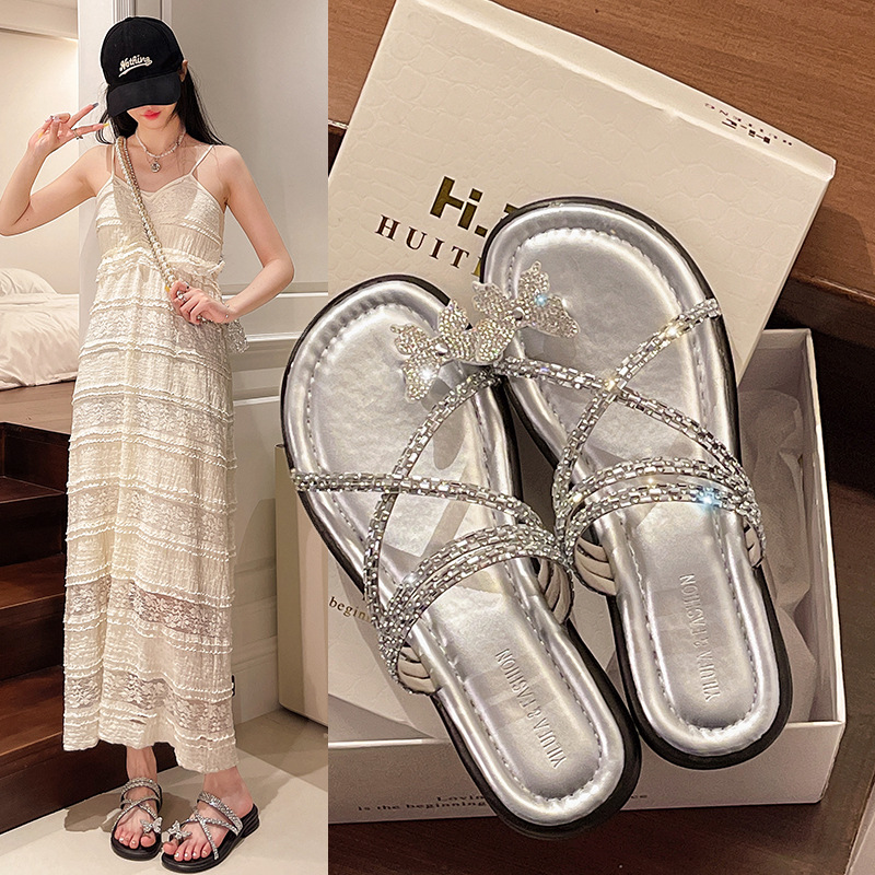 夏季新款凉拖鞋一字时尚女水钻珍珠带罗马潮蝴蝶结一字拖批发法式