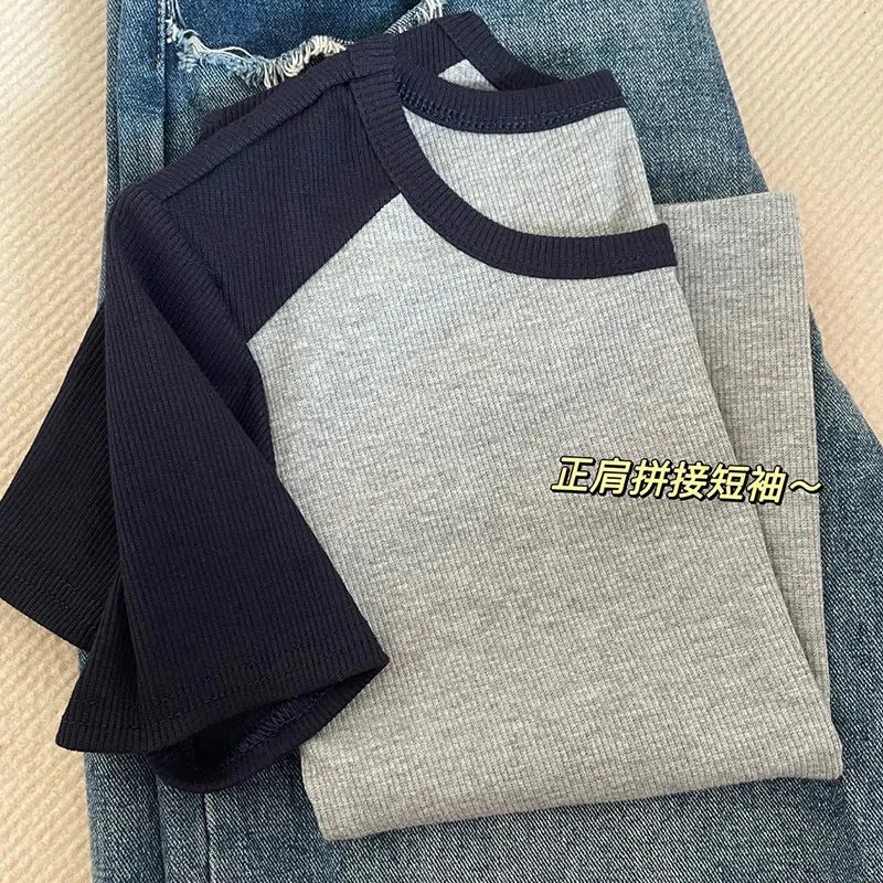 品牌专柜撤回重磅正肩短袖T恤女拼接撞色显瘦辣妹百搭潮流BF上衣