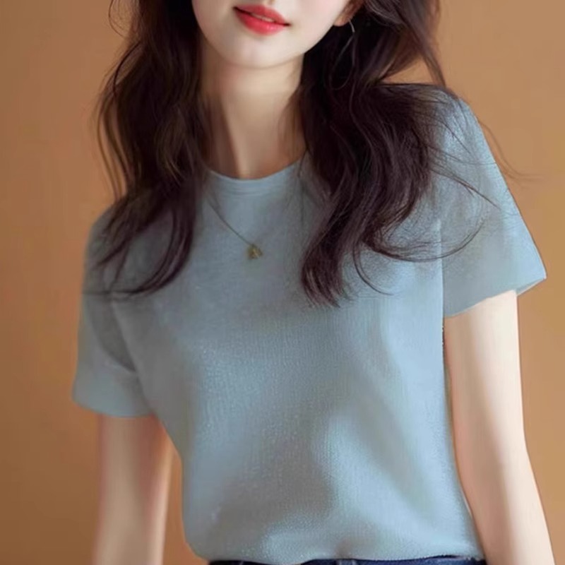 蓝色正肩短袖t恤女装夏季2025爆款欧货小衫冰丝针织独特别致上衣