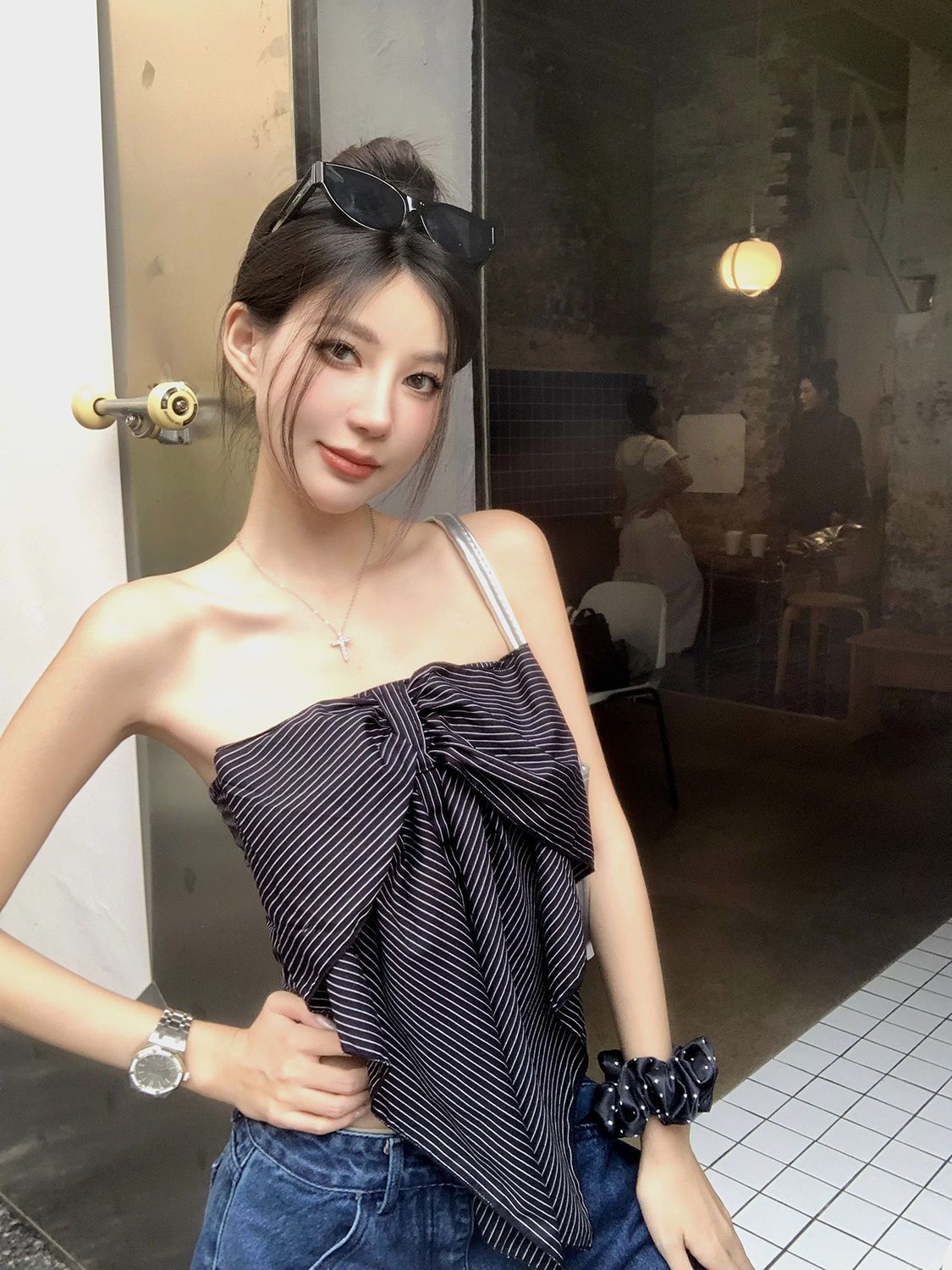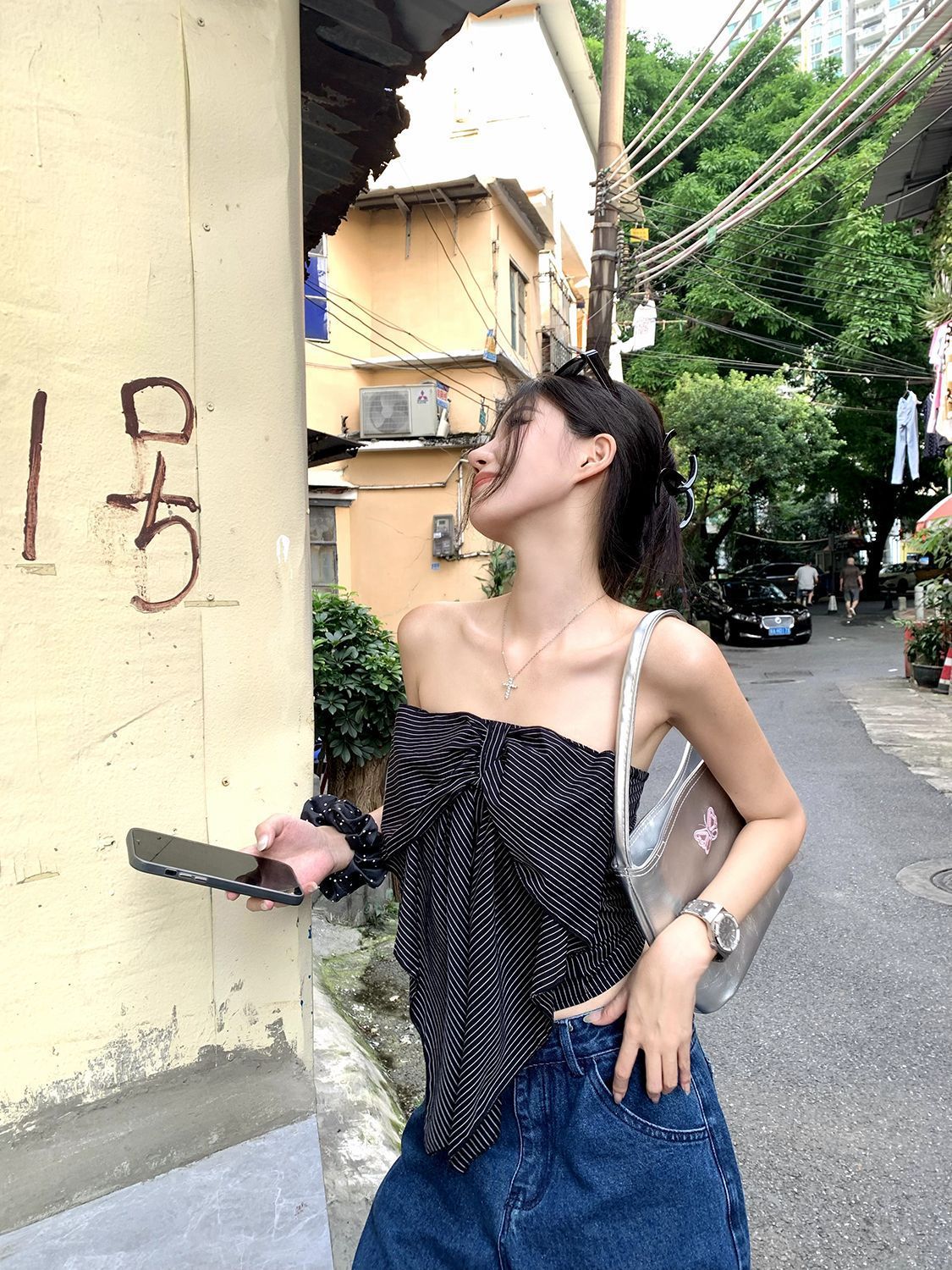 辣妹性感抹胸条纹蝴蝶结衬衫夏季新款设计感百搭减龄修身短款上衣