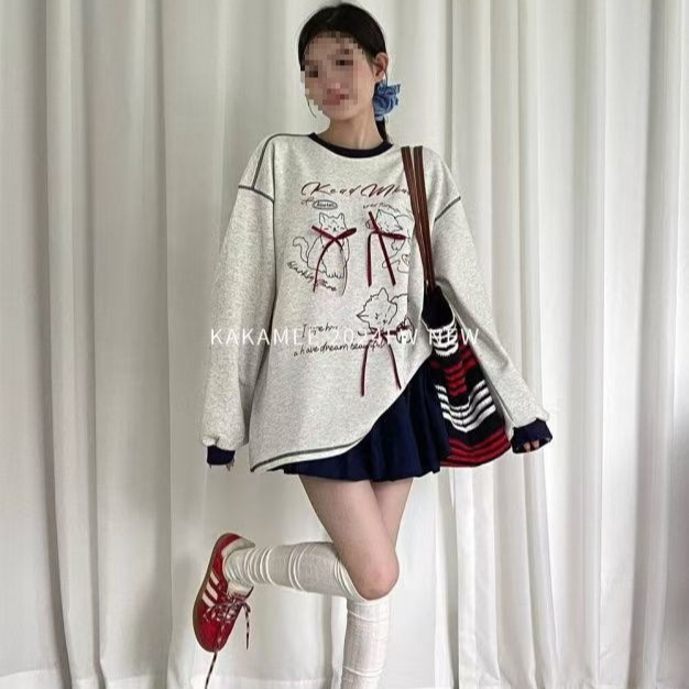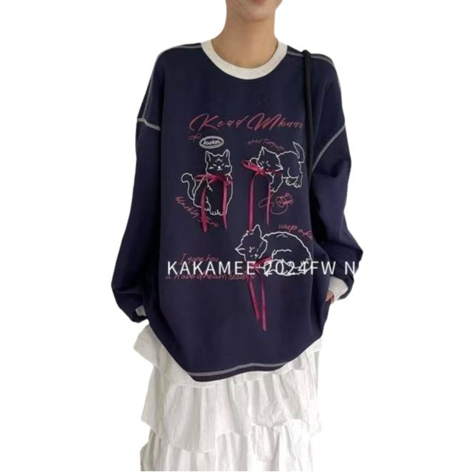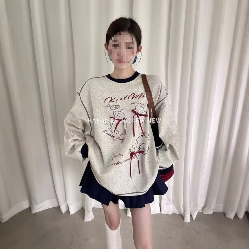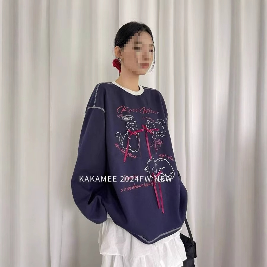 卡通猫咪印花蝴蝶结长袖卫衣女秋季新款设计感撞色慵懒风宽松上衣
