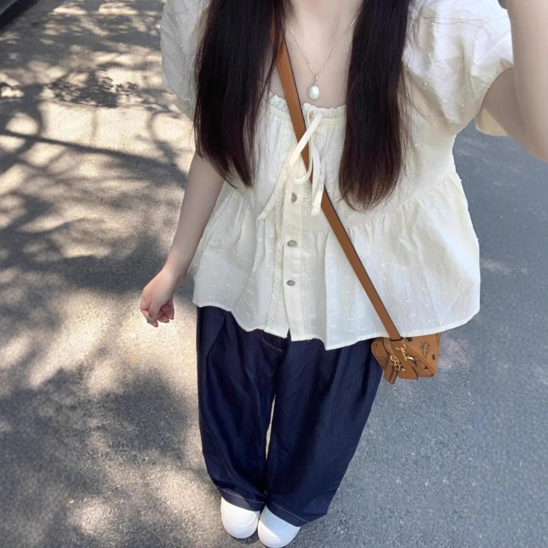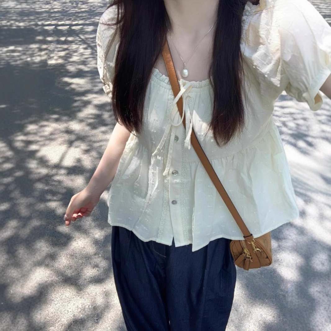 法式甜美蕾丝边娃娃衫短袖衬衫女夏季别致修身显瘦泡泡袖方领上