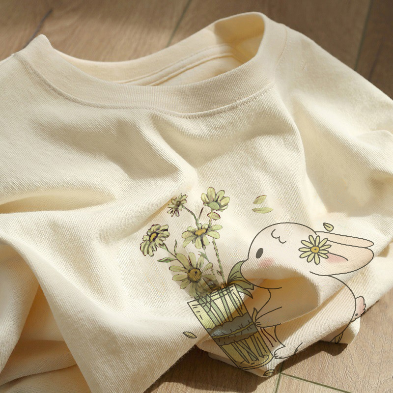美式vintage纯棉杏色短袖t恤女夏季大码200斤胖mm印花宽松上衣