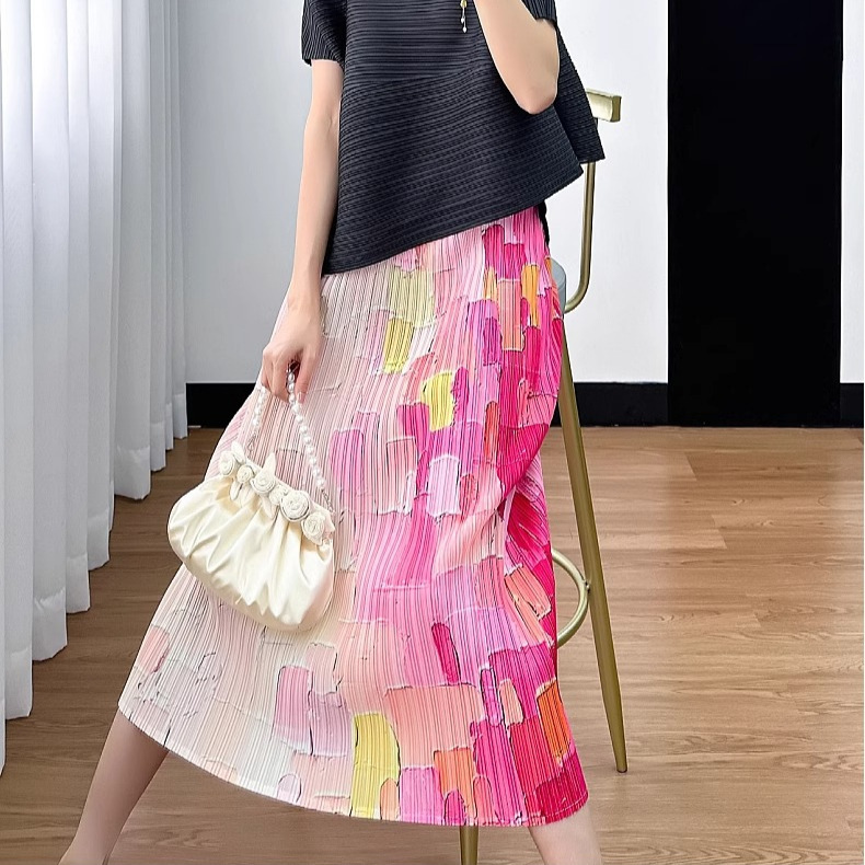 大码褶皱开叉半身裙女夏季新款高腰显瘦小众设计感a字百褶裙欧货