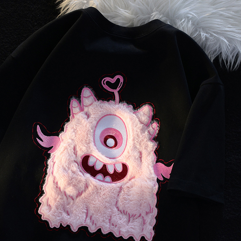 美式复古粉色小怪兽立体绣花短袖t恤女纯棉宽松高街潮牌半袖上衣