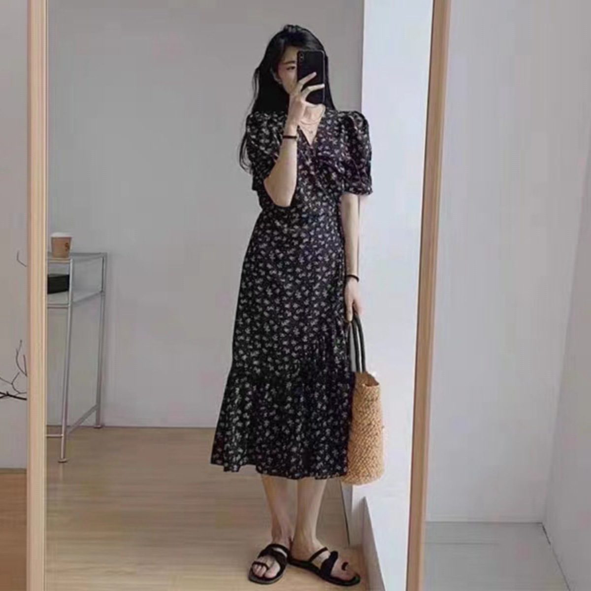 夏季新款法式桔梗雪纺V领清新甜美温柔风收腰显瘦碎花连衣裙