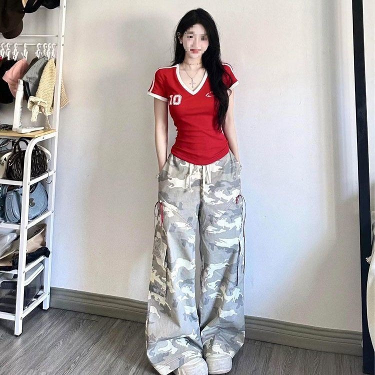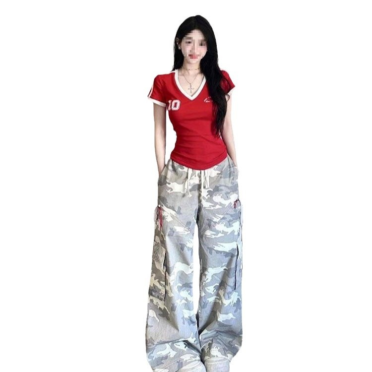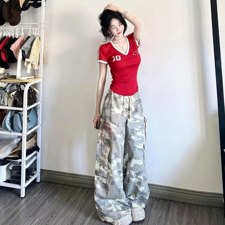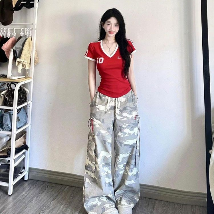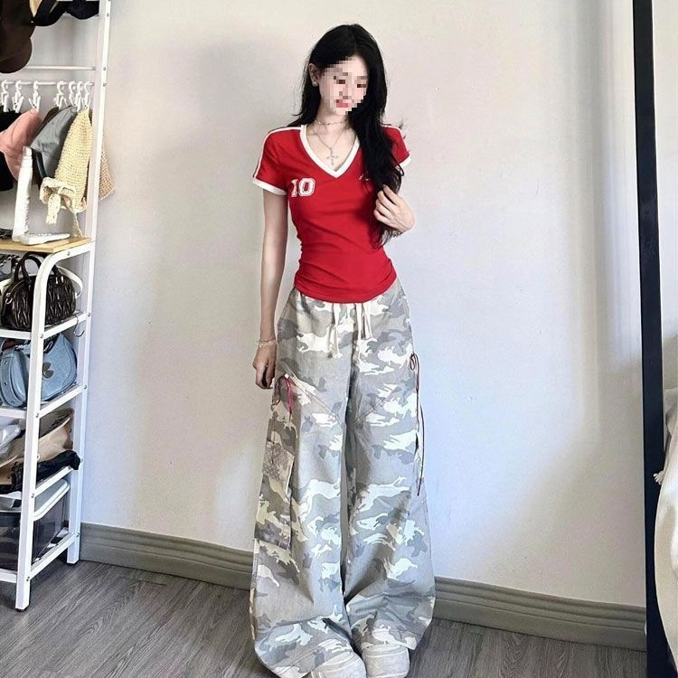 美式红色V领短袖球衣t恤女夏季新款修身收腰辣妹别致短款上衣
