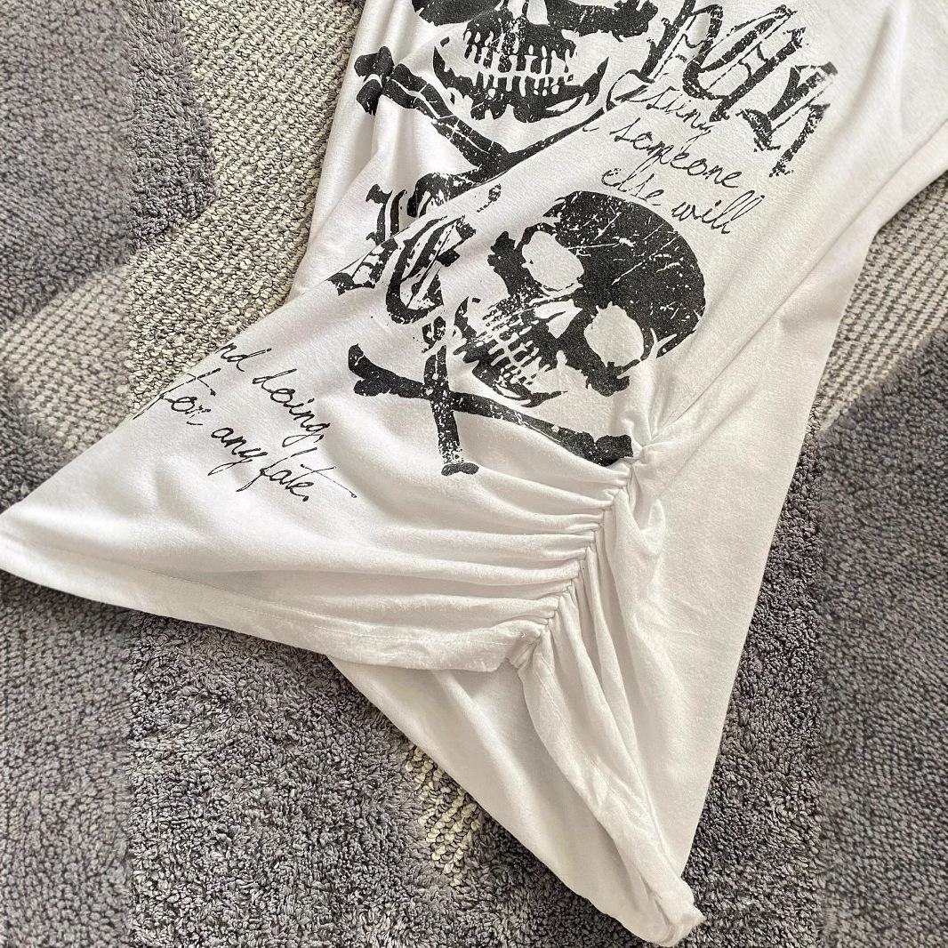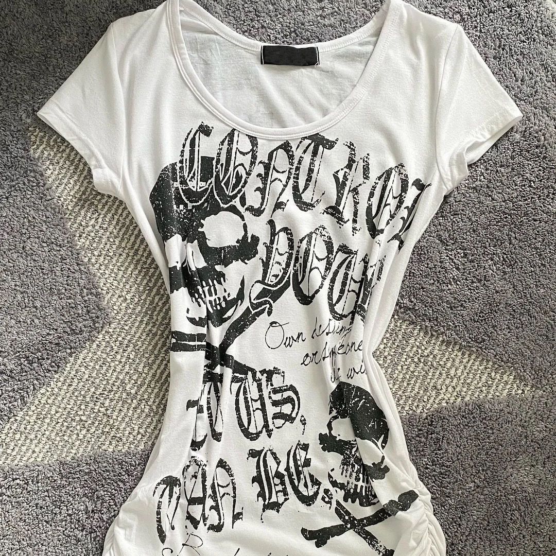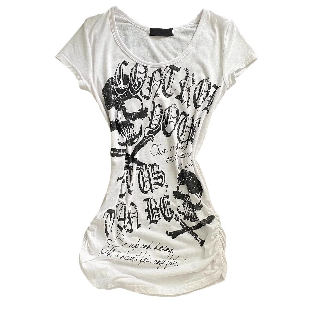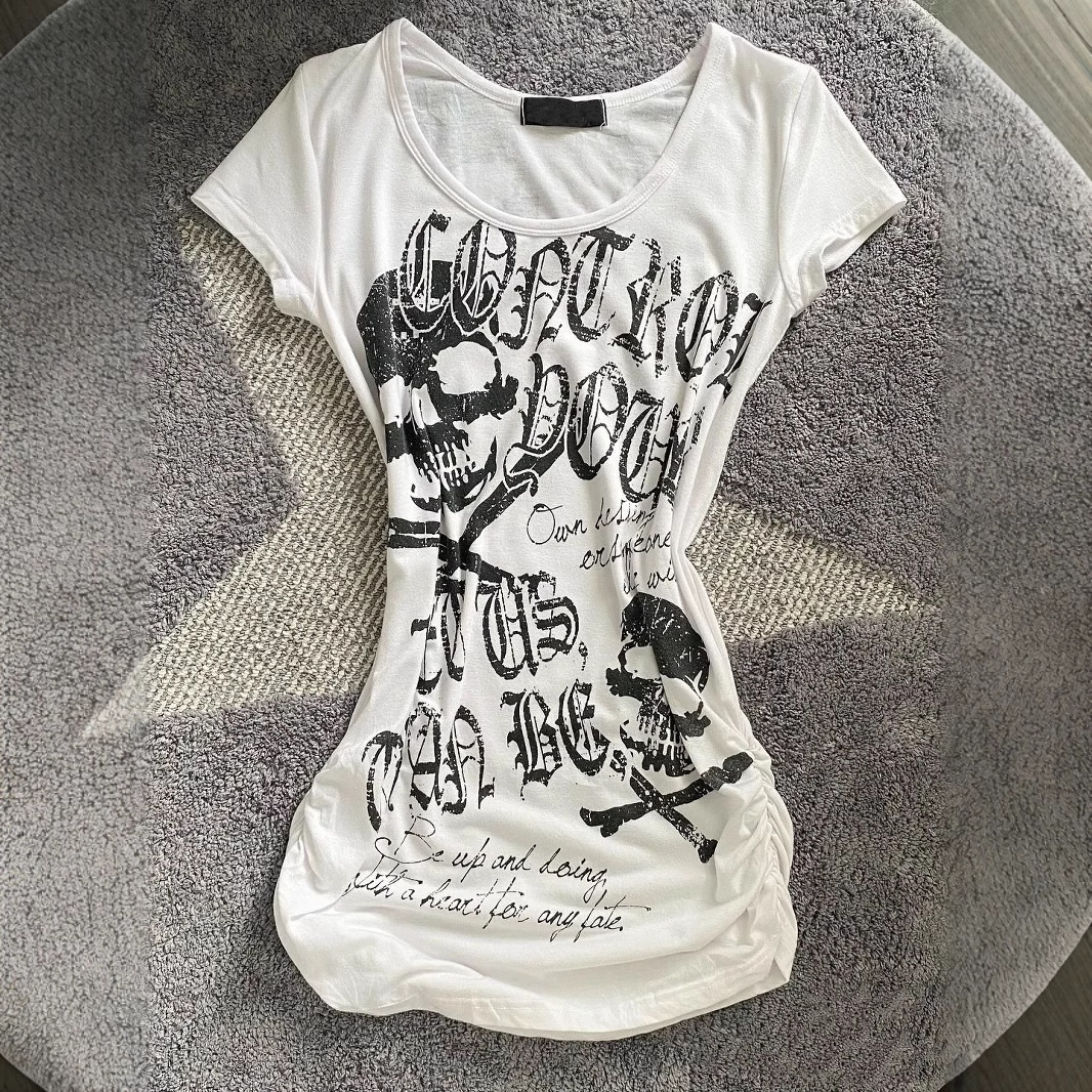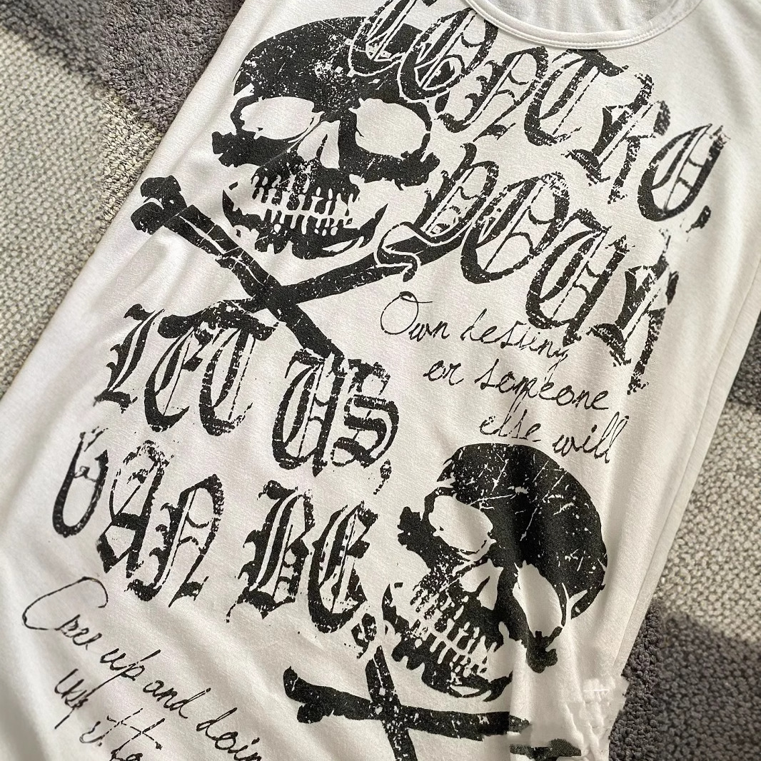 vintage 古着收腰修身朋克摇滚短袖美式黑色骷髅头骨头印花上衣款