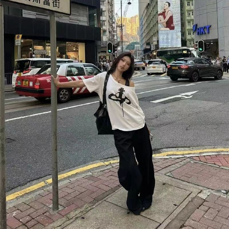 国潮纯棉新款牌土星印花白色短袖t恤女夏季宽松开叉大圆领上衣潮