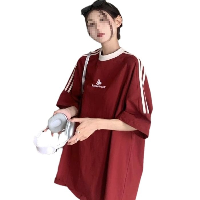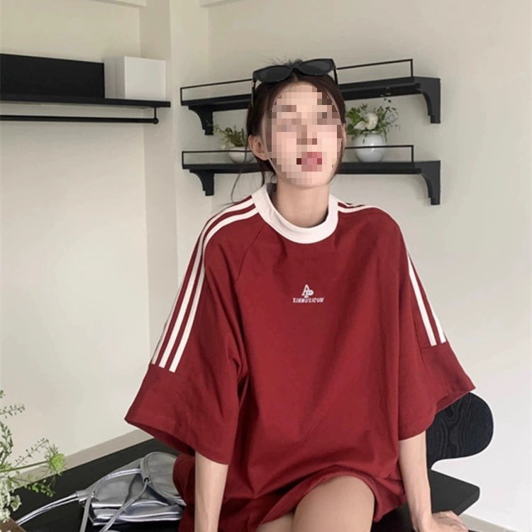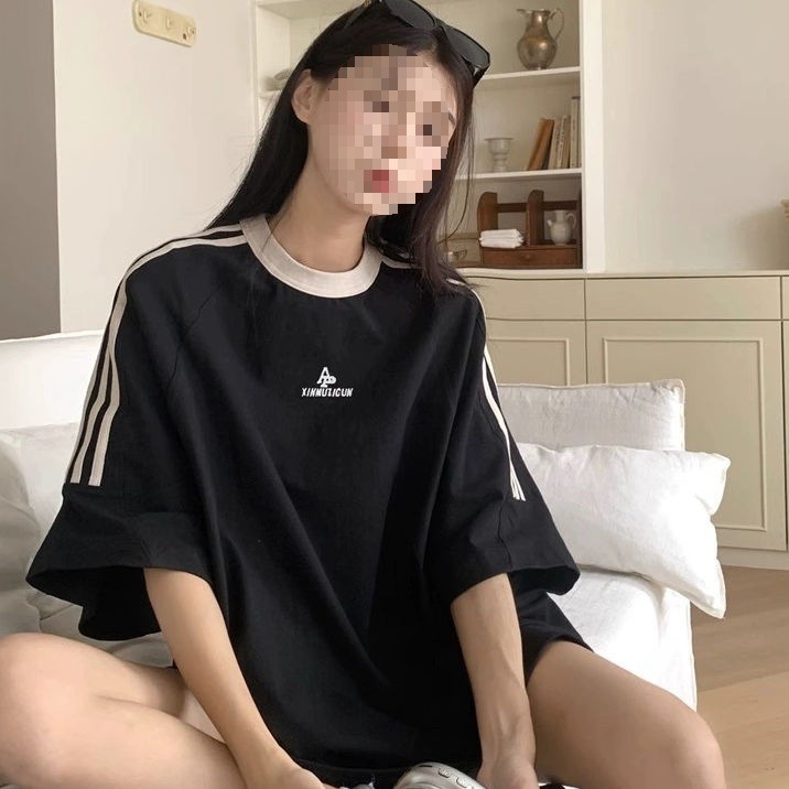 港味杠条短袖T恤女夏设计感字母印花宽松显瘦多巴胺穿搭上衣