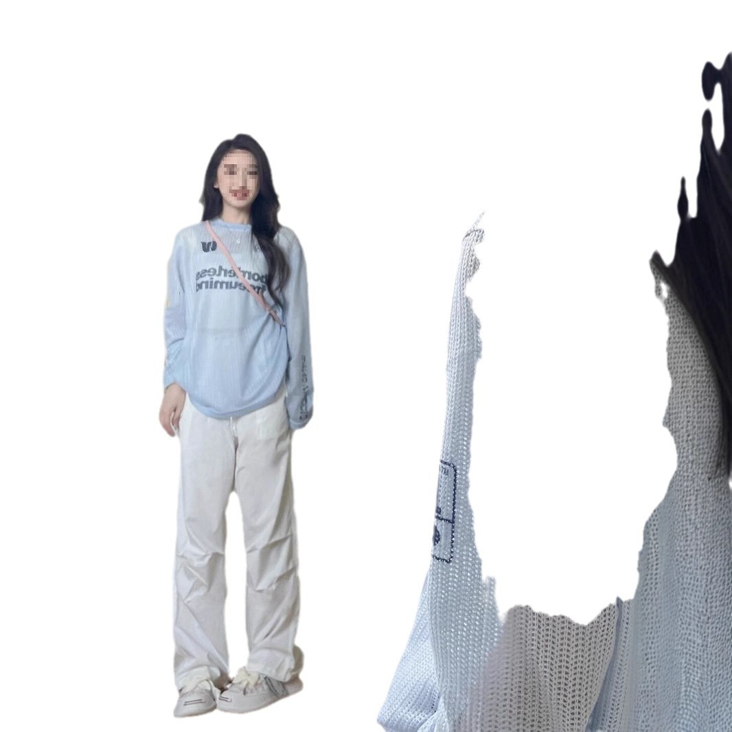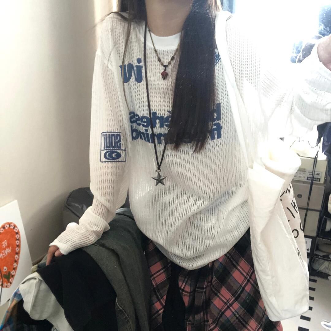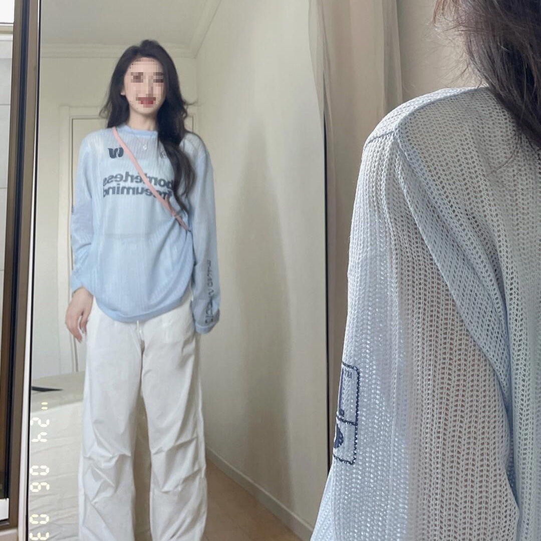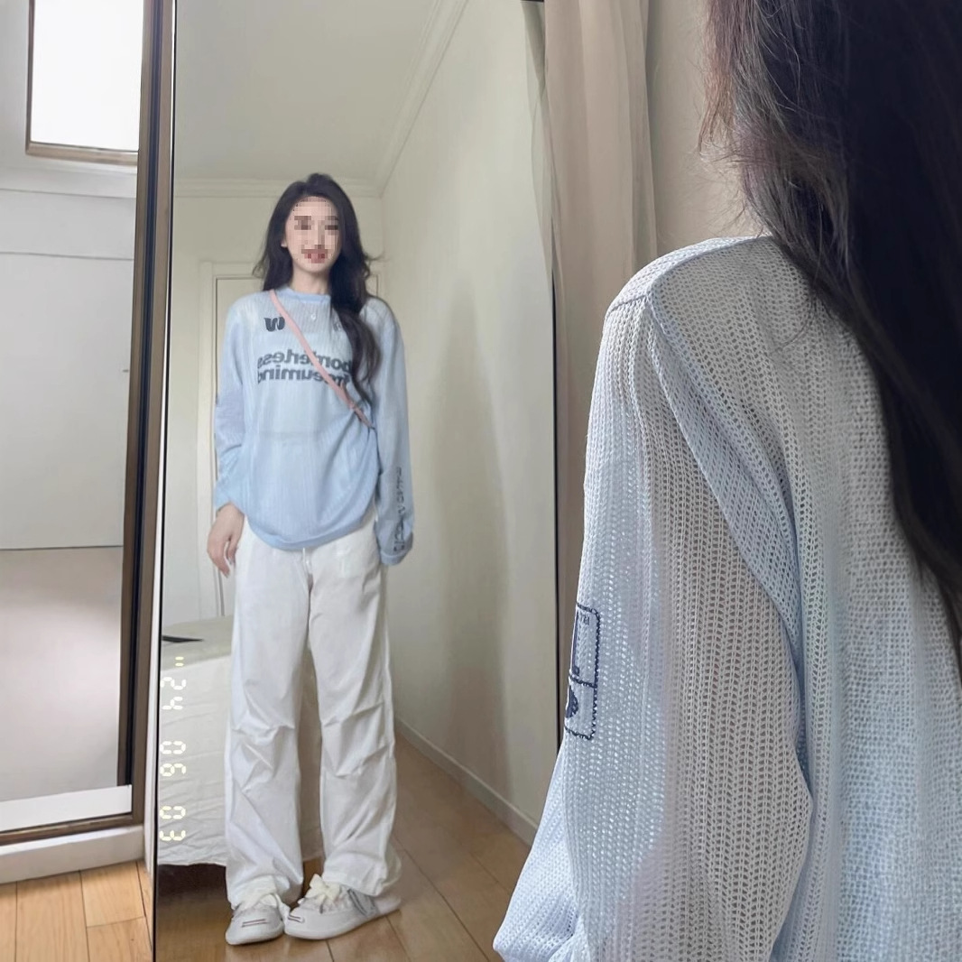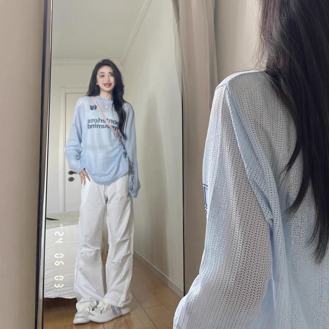 国潮牌字母微透蓝色长袖防晒服女夏季薄款宽松原宿风休闲百搭上衣