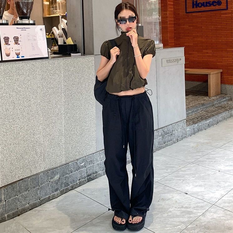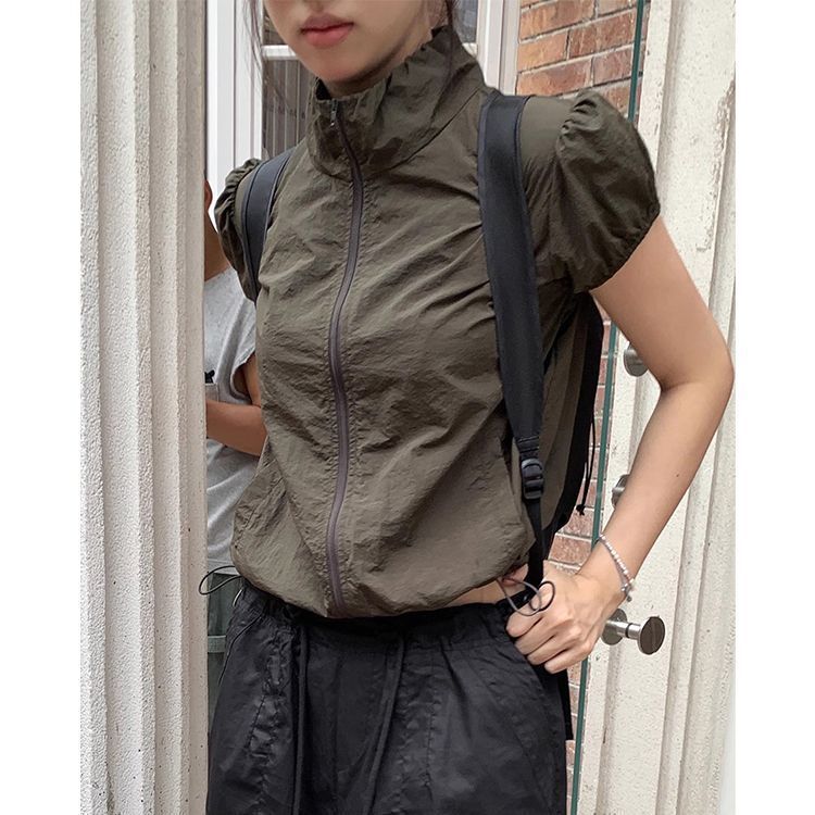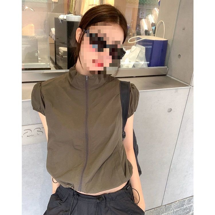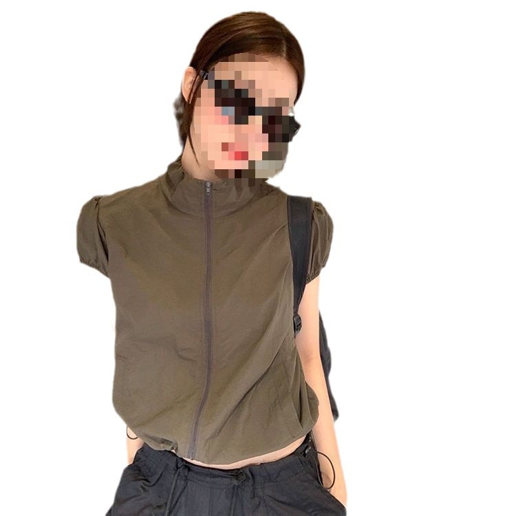 年夏季新款露营风复古棕薄款立领短款拉链防晒T恤女显瘦上衣