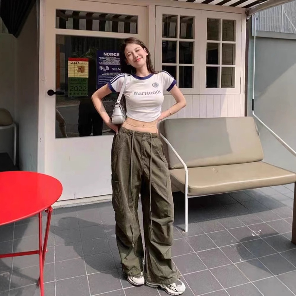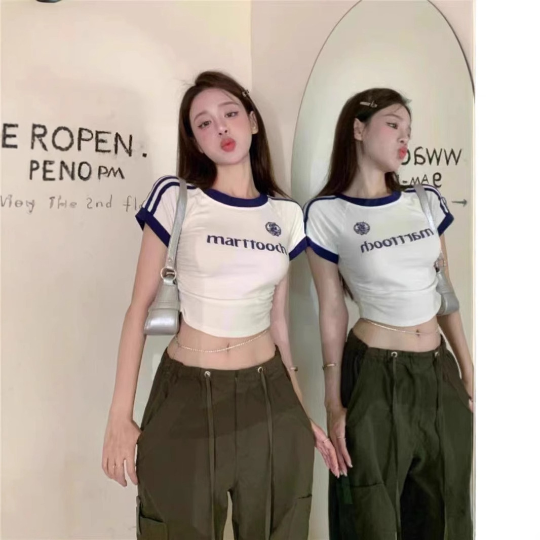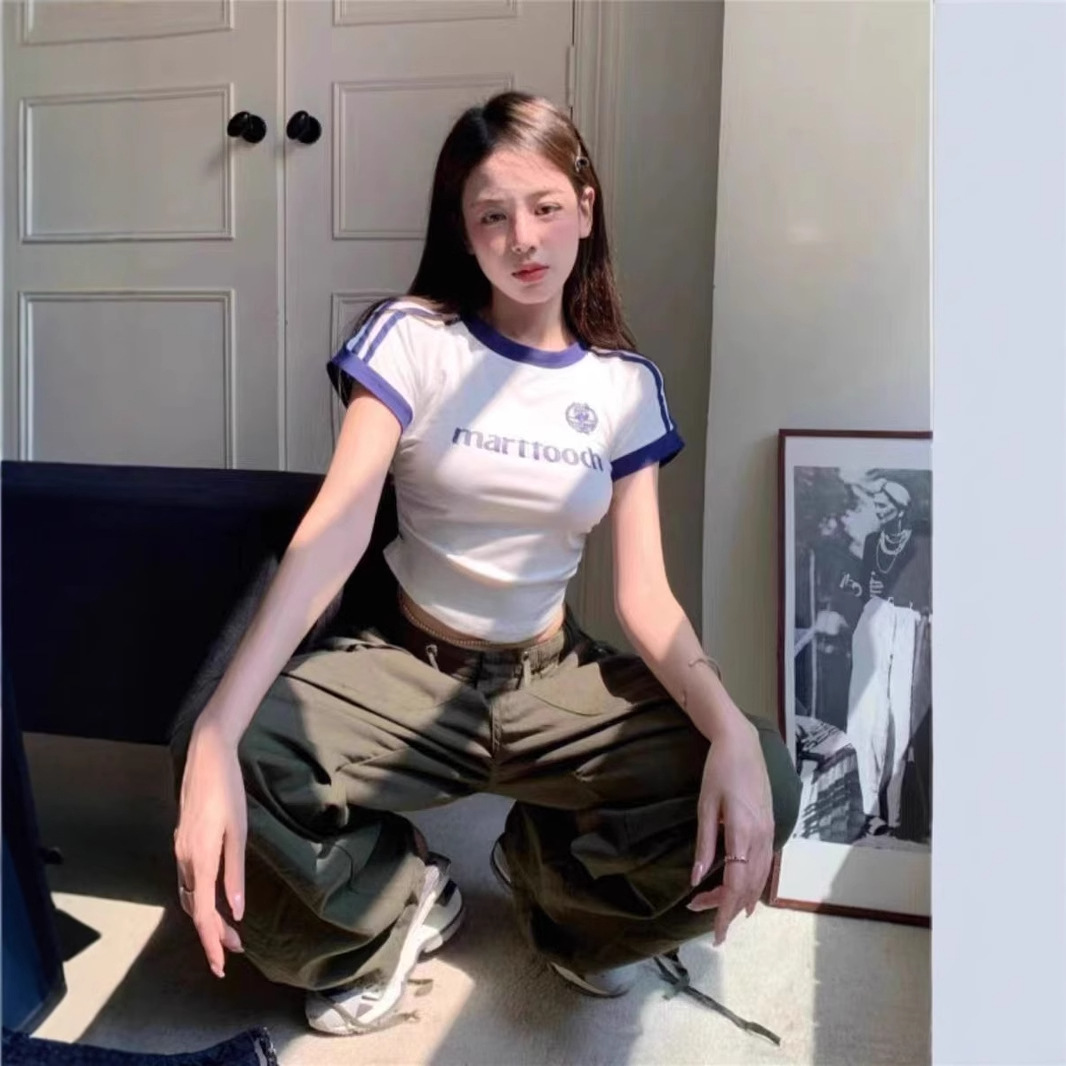 美式辣妹撞色短袖T恤女ins2025夏季复古新款修身显瘦印花短款上衣