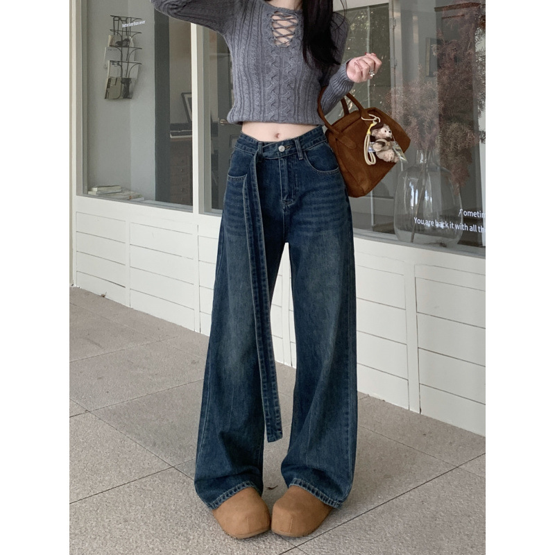 新款韩系气质甜酷辣妹腰带设计显瘦宽松牛仔直筒拖地裤女