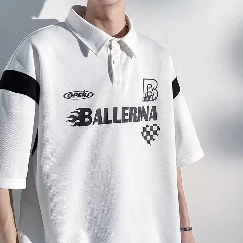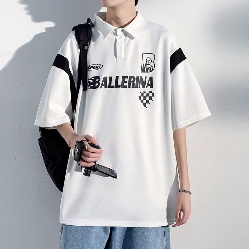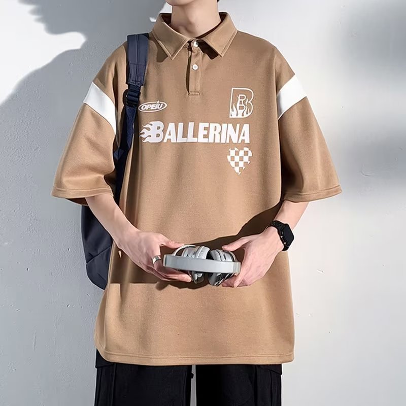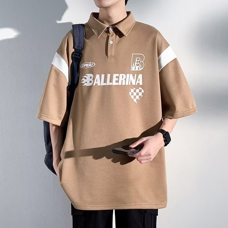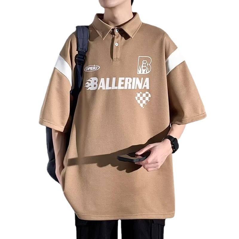 男士polo衫短袖美式潮牌潮流翻领t恤七分袖夏季宽松大码体恤半袖